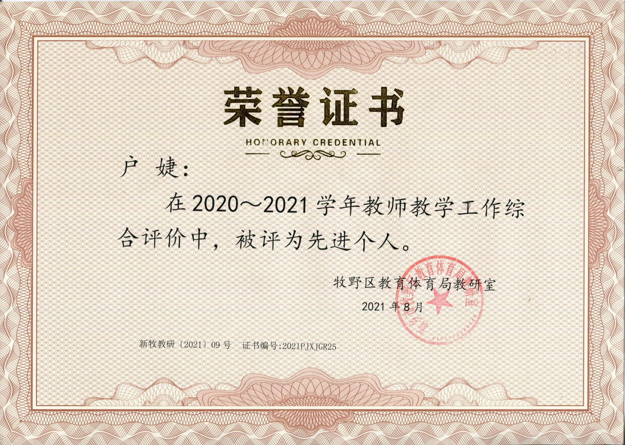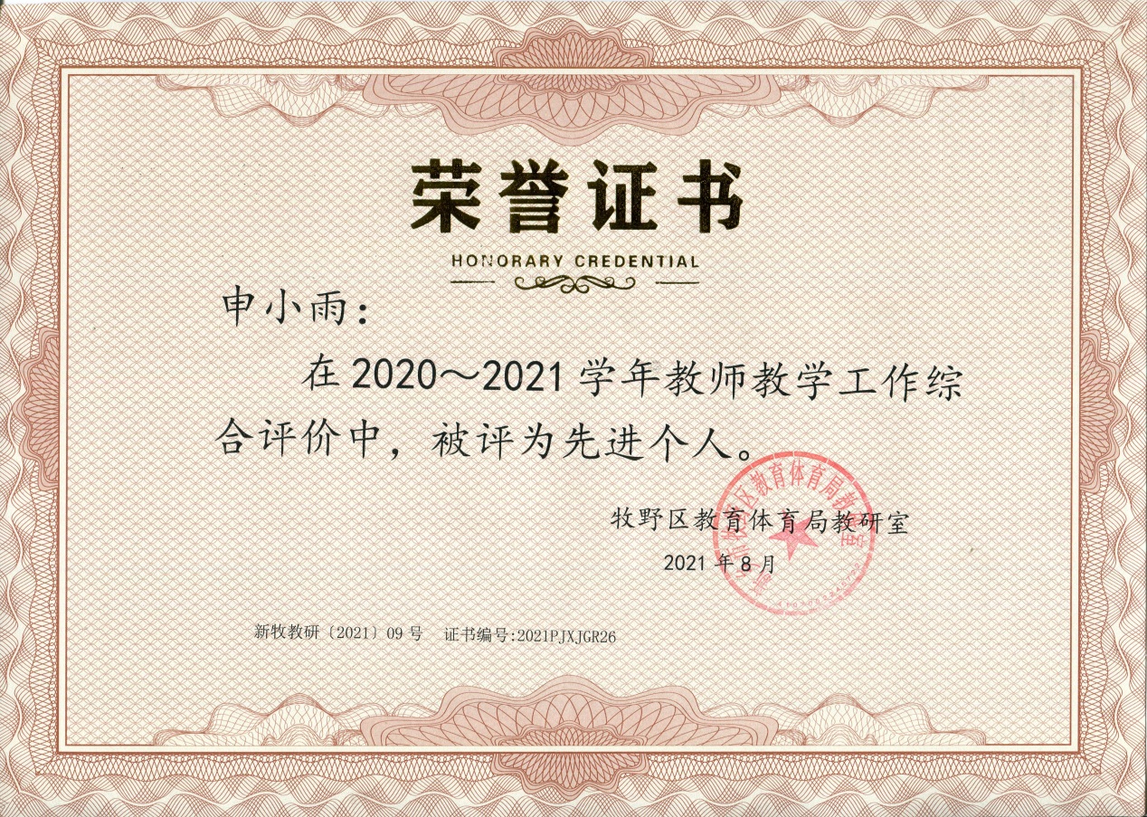 在2020-2021学年教师教学工作综合评价中,我校教师户婕、申小雨获牧野区教师教学工作综合评价先进个人。