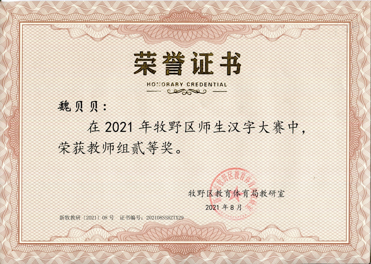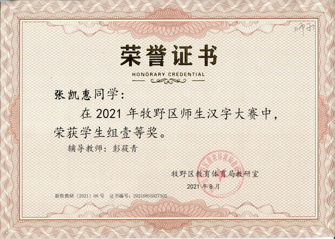在牧野区师生汉字大赛中,我校魏贝贝老师获教师组二等奖;张凯惠同学获学生组一等奖,彭筱青老师获辅导教师奖。