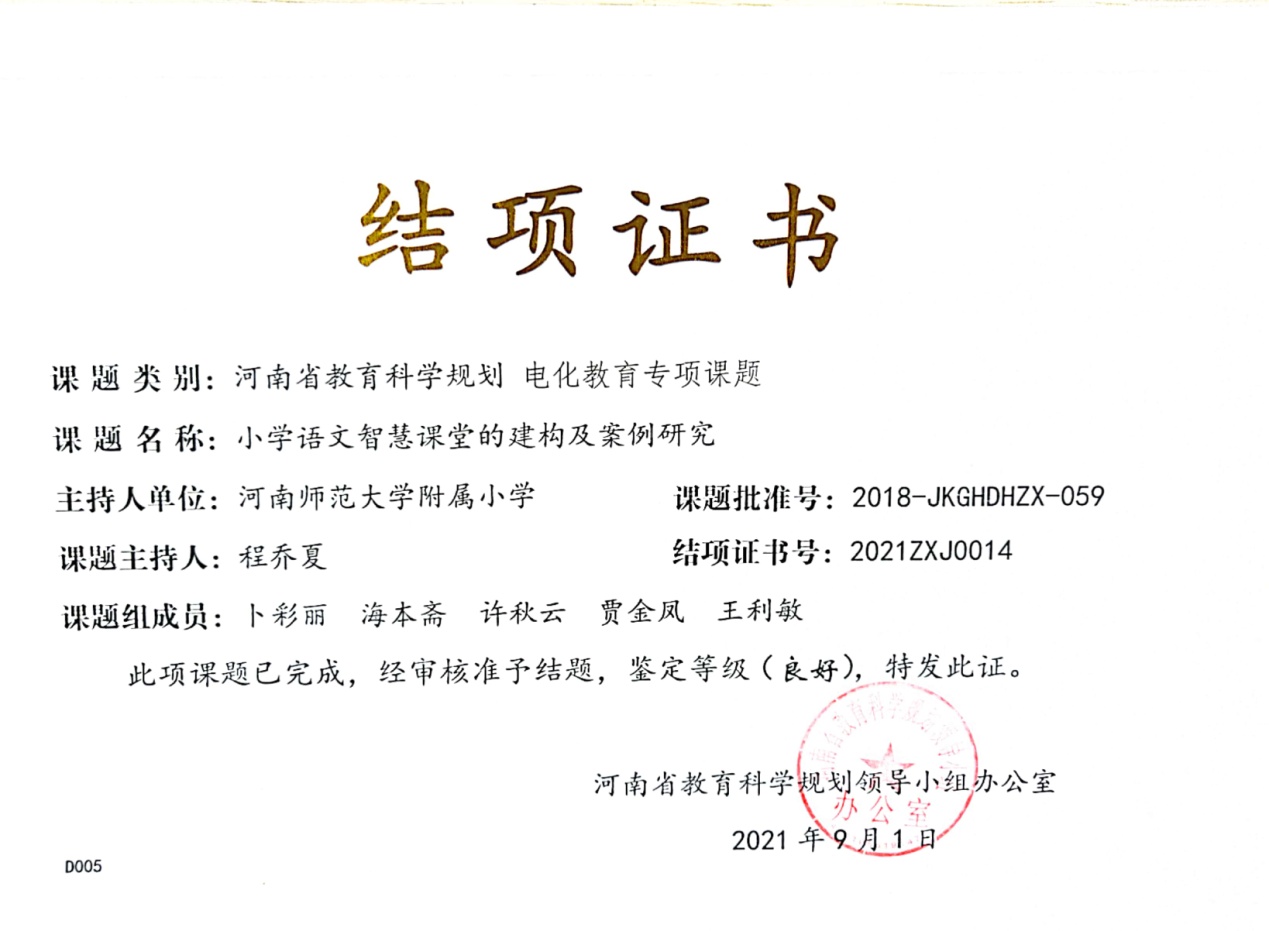 2021年9月,我校程乔夏书记主持的河南省教育科学规划电化教育专项课题《小学语文智慧课堂的建构及案例研究》,已经完成,经审核准予结题,鉴定为良好等级。