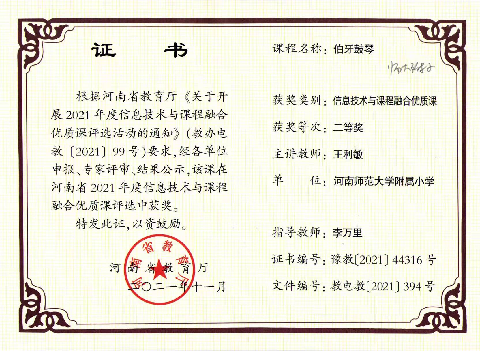 2021年11月,在河南省2021年度信息技术与课程融合优质课评选中,我校王利敏老师执教的《伯牙绝弦》一课荣获省二等奖。
