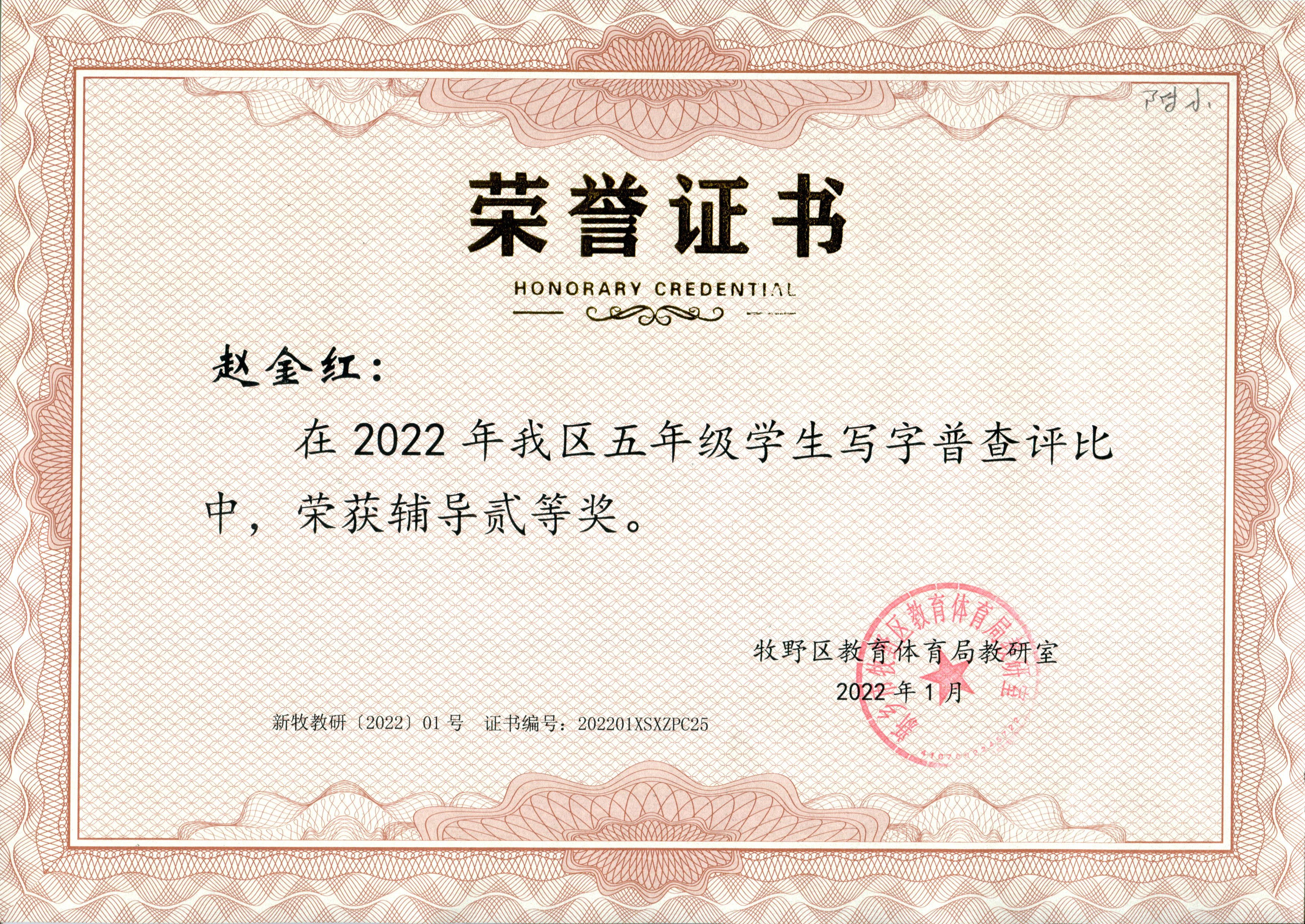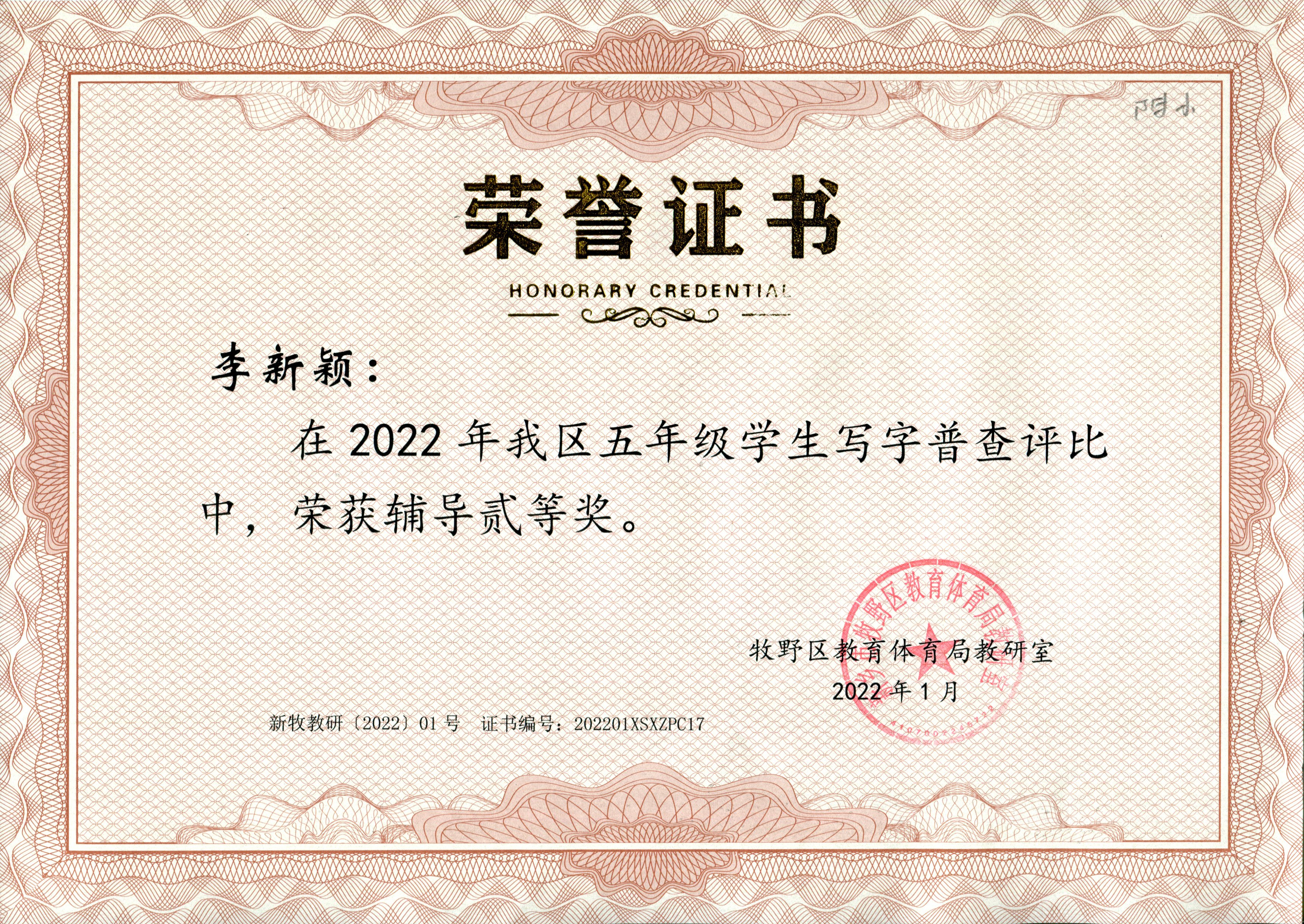 月,在牧野区五年级学生写字普查评比中,李新颖、赵金红老师均获辅导二等奖。