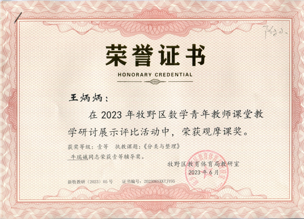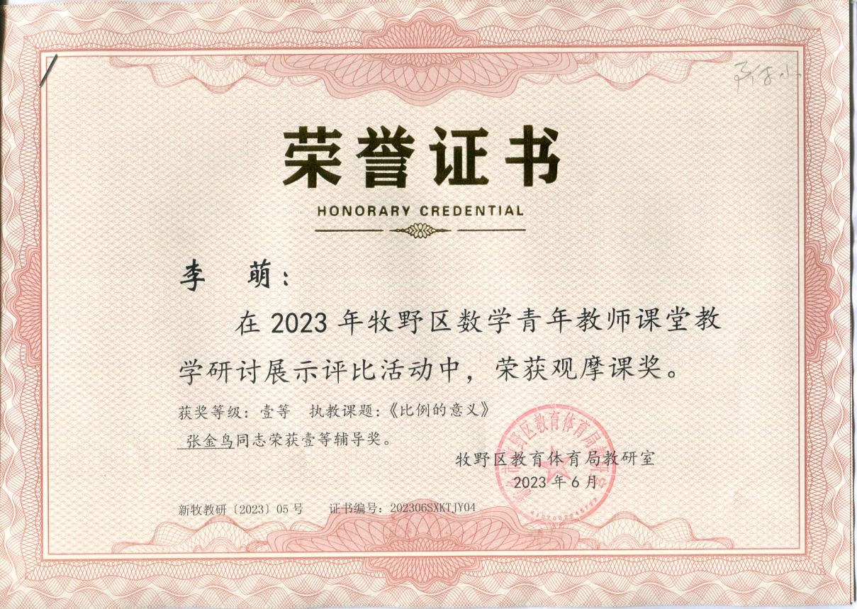 2023年6月,李萌执教的《比例的意义》在获牧野区数学青年教师课堂教学研讨展示评比活动中,荣获观摩课一等奖;王炳炳执教的《分类与整理》在牧野区数学青年教师课堂教学研讨展示评比活动中,荣获观摩课一等奖。