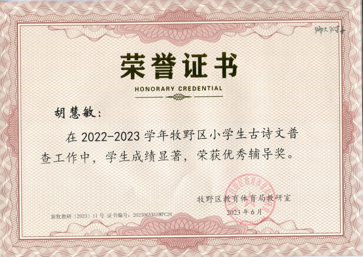 胡慧敏老师在牧野区小学生古诗文普查工作中,荣获优秀辅导奖。