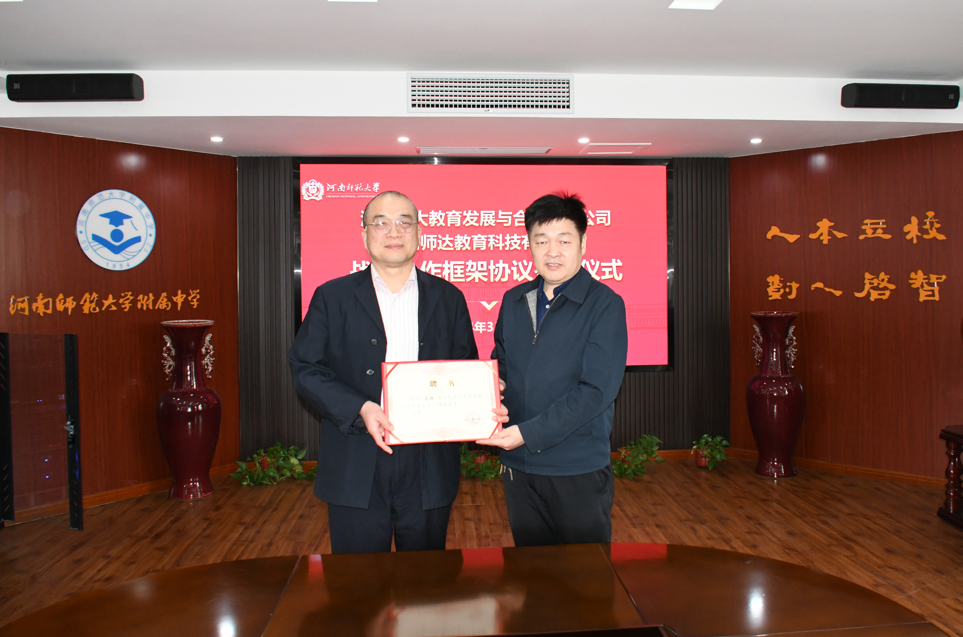 接着,李万里校长和零一未来教育科技(北京)有限公司李幸呈总监签约《伟德官网下载苹果版附属小学学生设计思维塑造暨创新教育合作协议书》,张银付书记和毕卓然总经理见证;李万里校长和河南师达教育科技有限公司签约《伟德官网下载苹果版附属小学战略合作框架协议》,张银付书记和毛新亮总经理见证;李万里校长为马恒教授颁发附属小学科学校长聘书,为毕卓然总经理颁发附属小学科技创新教育顾问聘书。