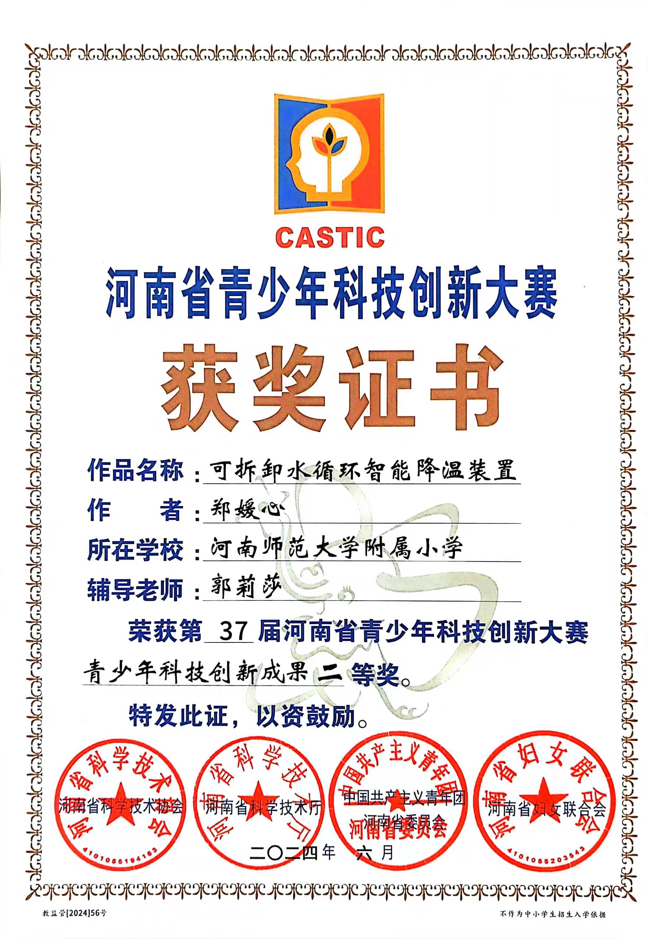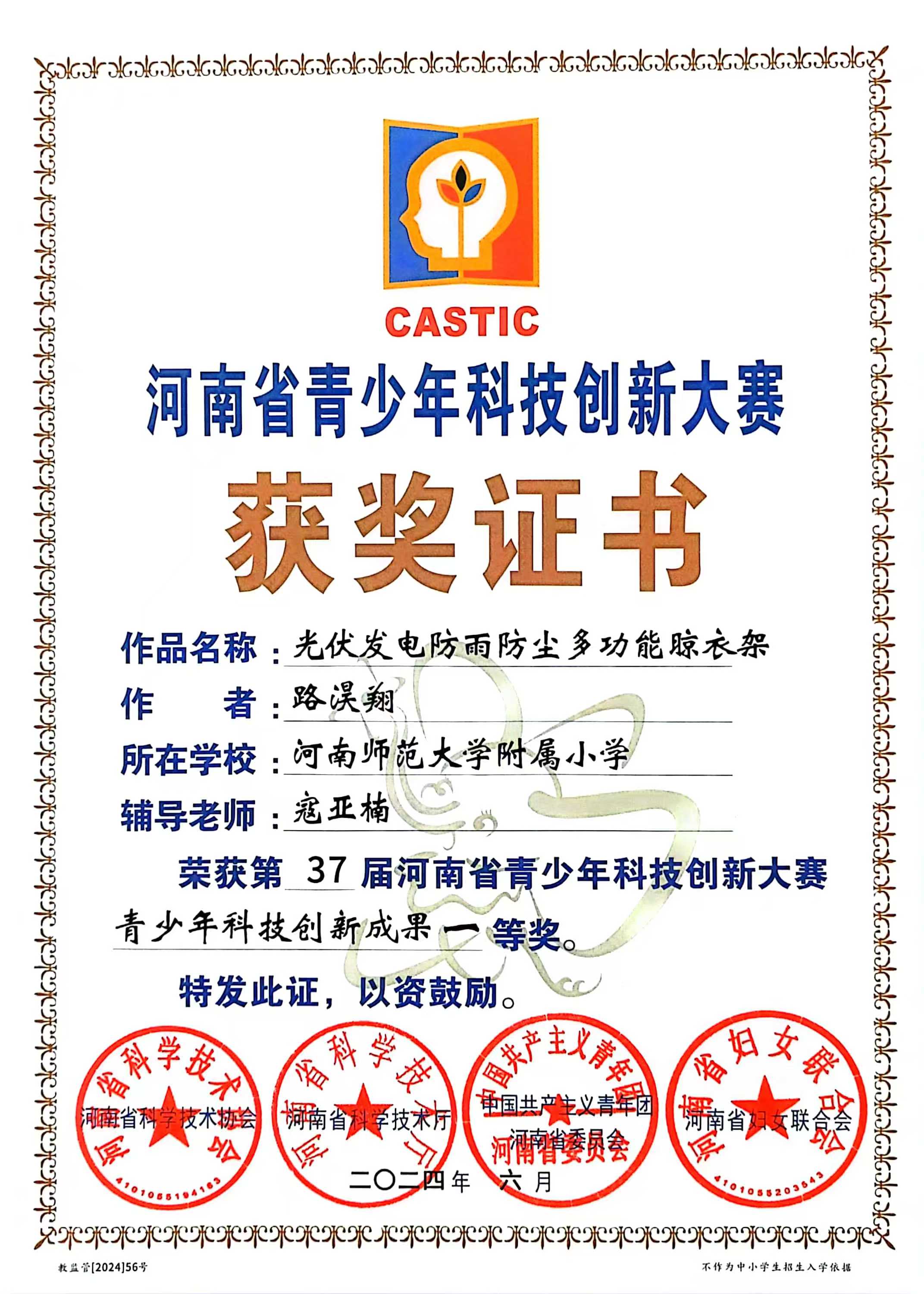 路淏翔同学制作的光伏发电防雨防尘多功能晾衣架,郑媛心同学制作的可拆卸水循环智能降温装置,分别荣获第37 届河南省青少年科技创新大赛青少年科技创新成果一等奖、二等奖。