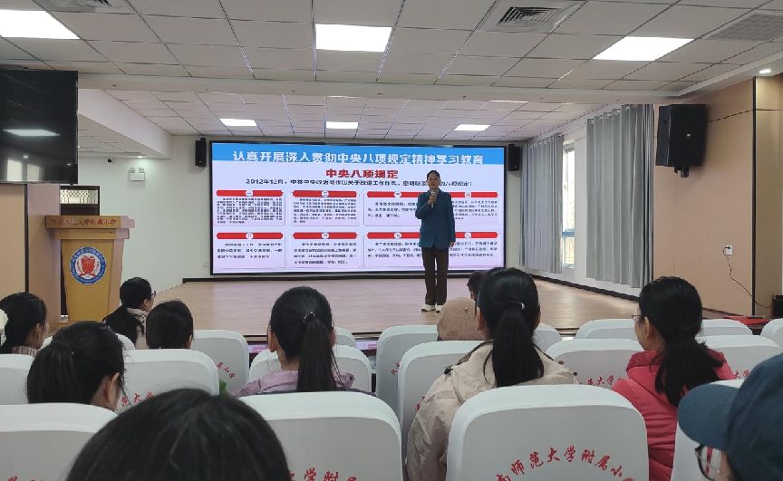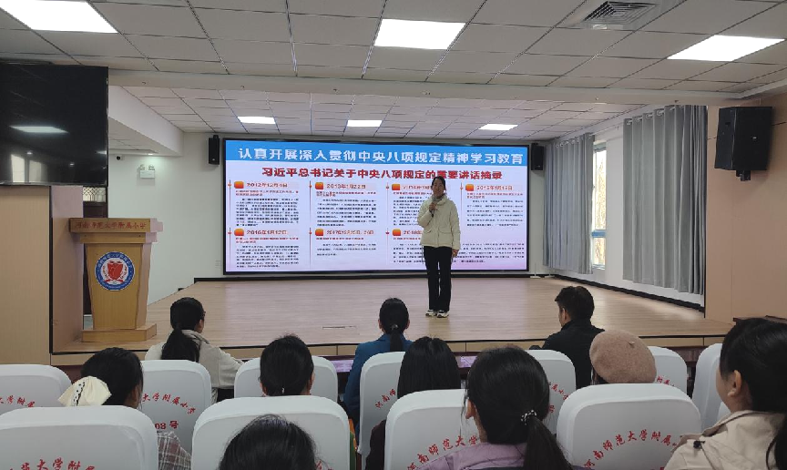 接着,党支部书记程乔夏领学了《习近平关于加强党的作风建设论述摘编》,组织委员赵金红带领学习《十八届中央政治局关于改进工作作风、密切联系群众的八项规定》,宣传委员许秋云带领学习了《习近平总书记关于中央八项规定的重要讲话摘录》。党员老师集体观看视频《八项规定出台 开启党风激浊扬清之变》。