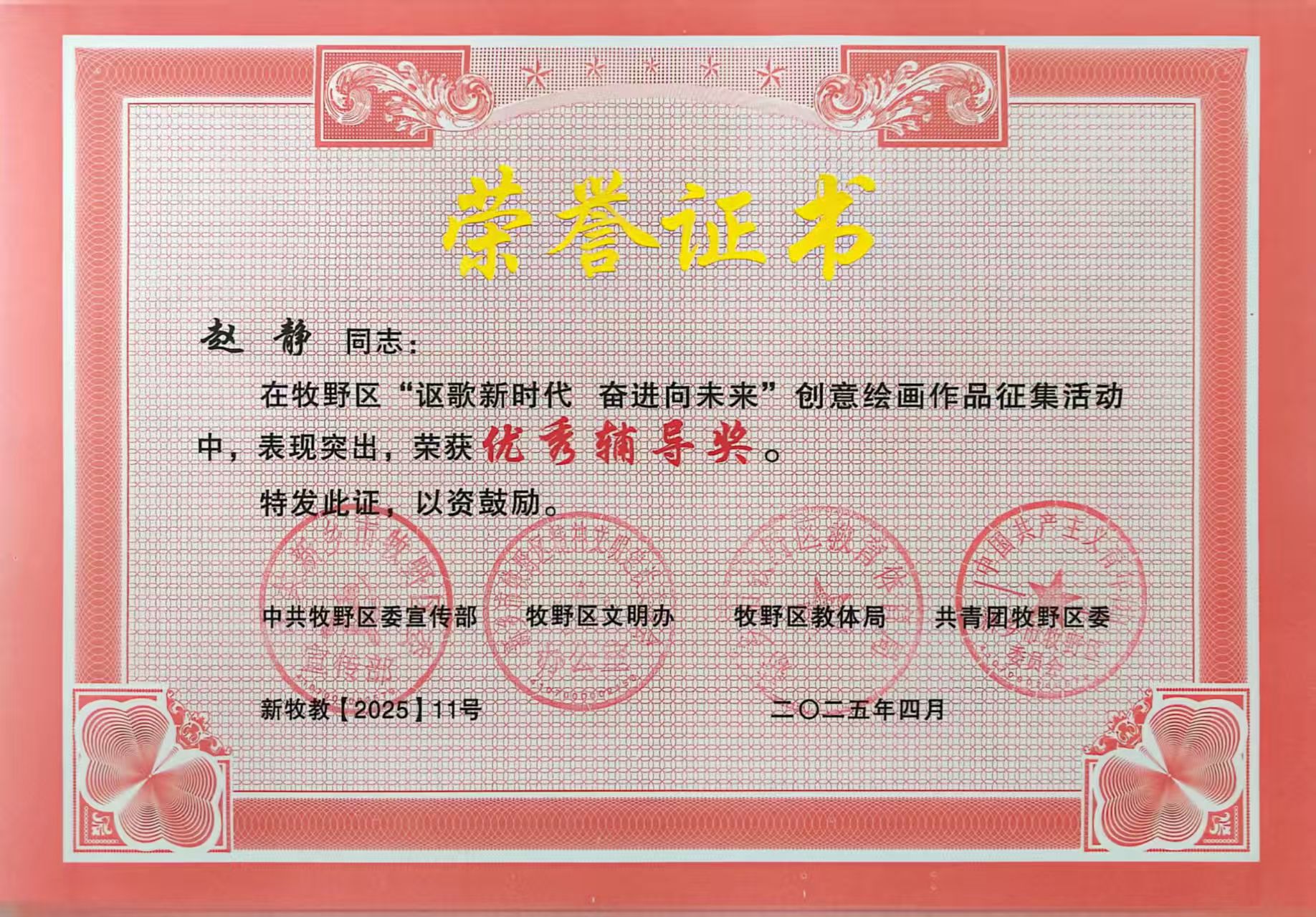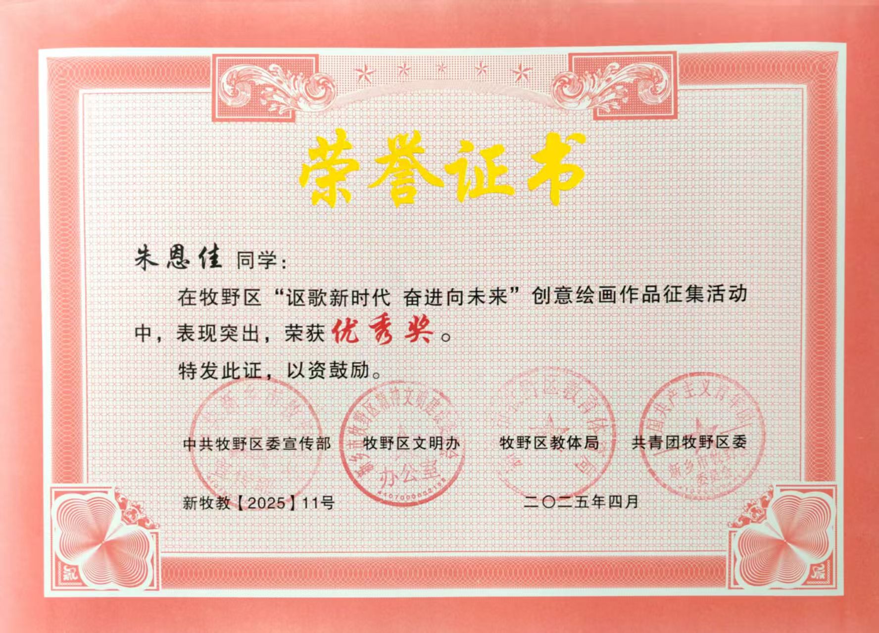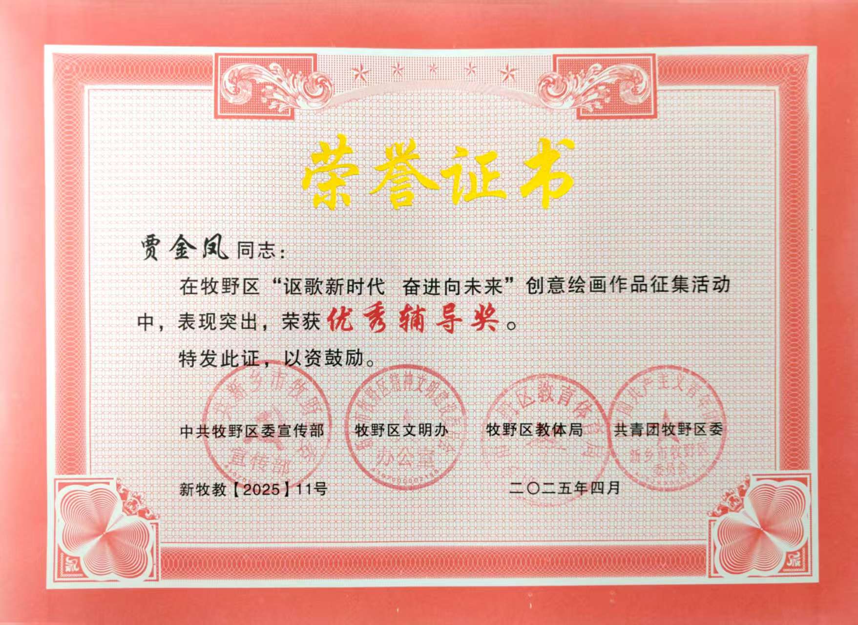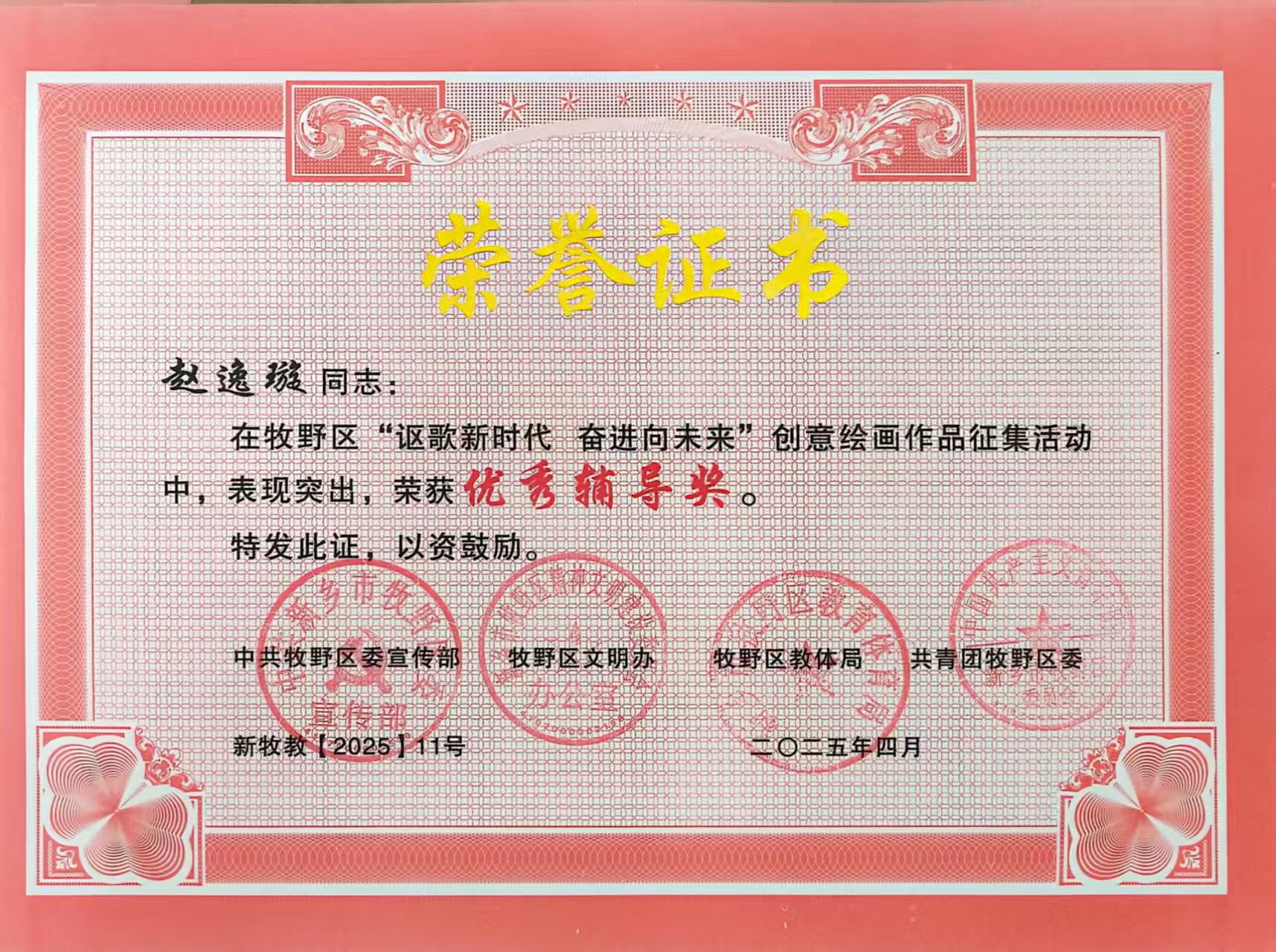 在牧野区“讴歌新时代 奋进向未来”创意绘画作品征集活动中,朱恩嘉、王嘉文、朱煜诚、何紫涵、张默语、李欣窈六位同学表现突出,荣获优秀奖,王利敏、赵静、赵逸璇、张晗、贾金凤、邹丽娜老师荣获优秀辅导奖。