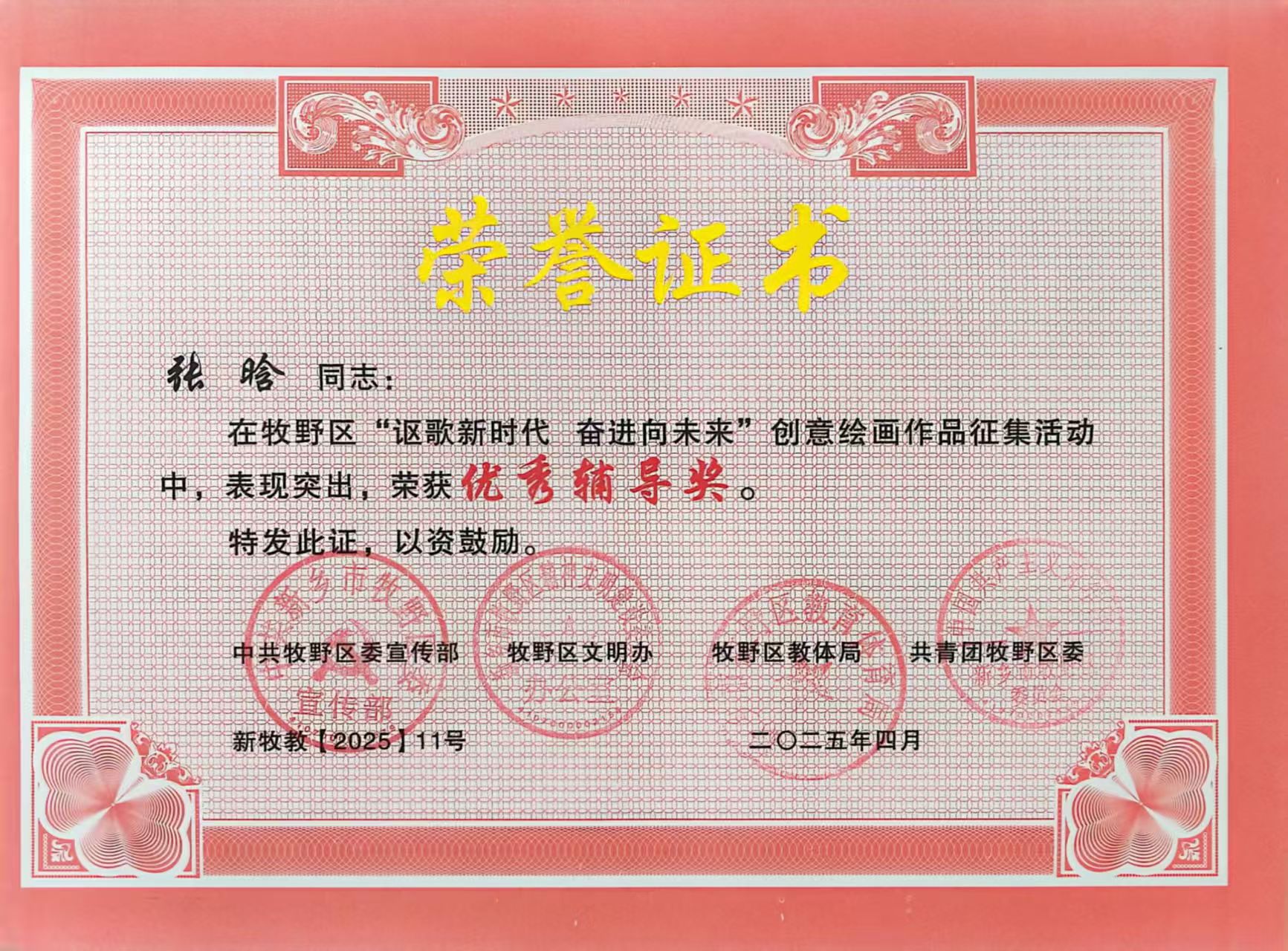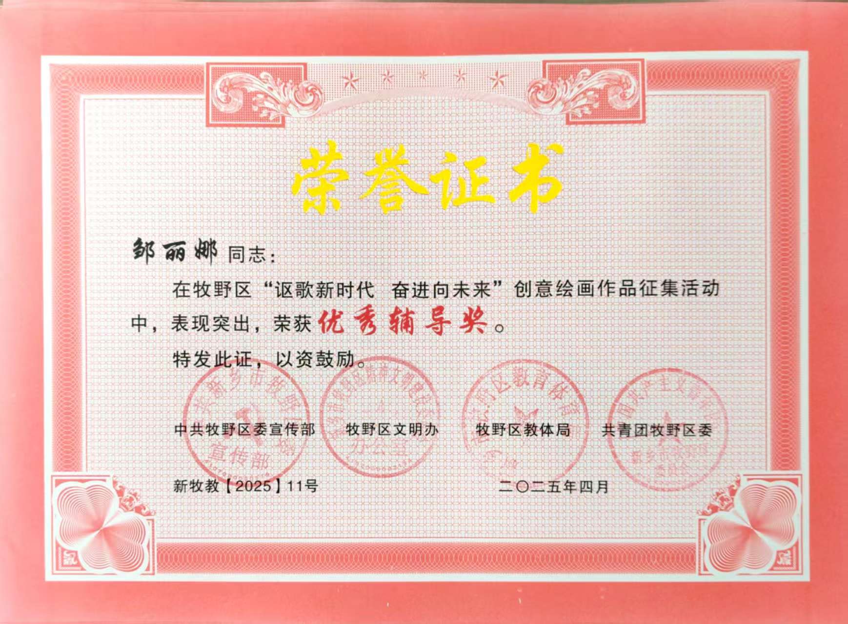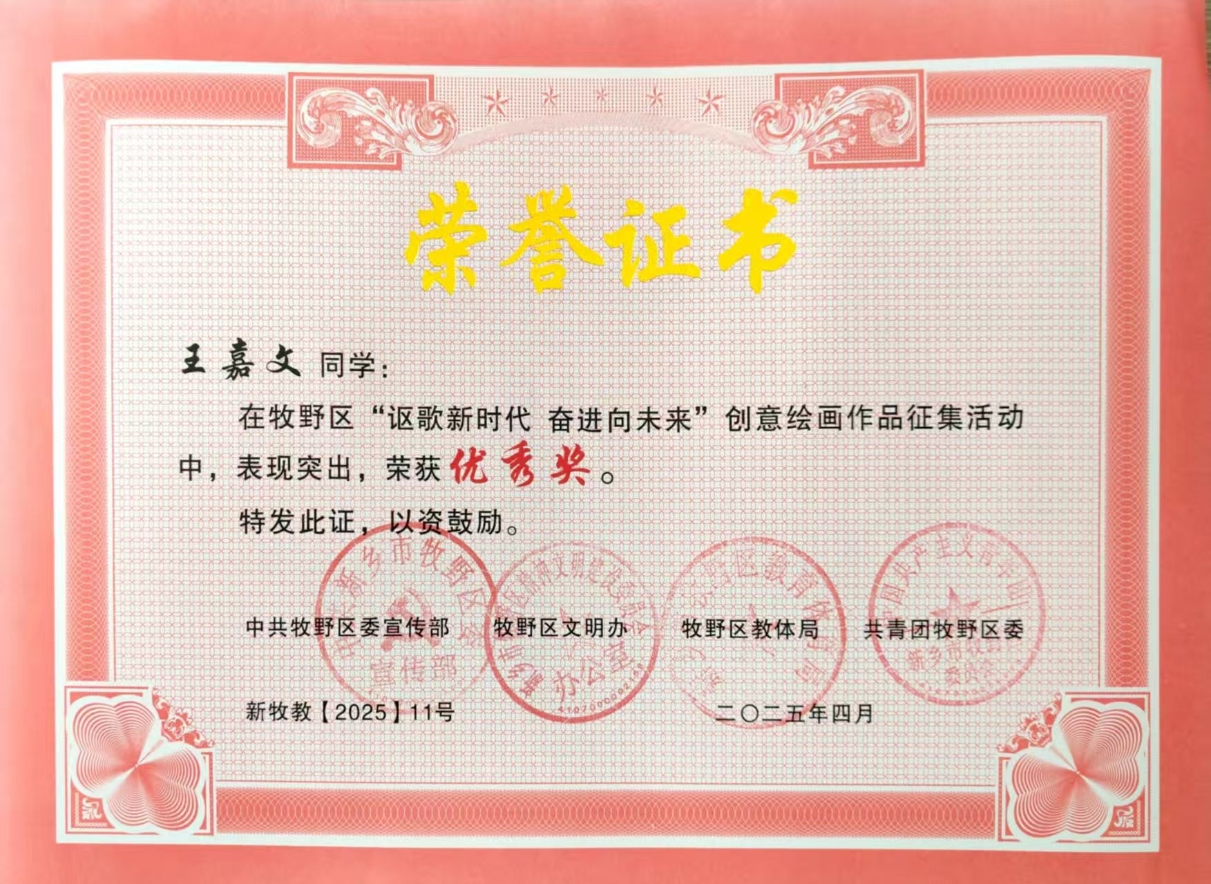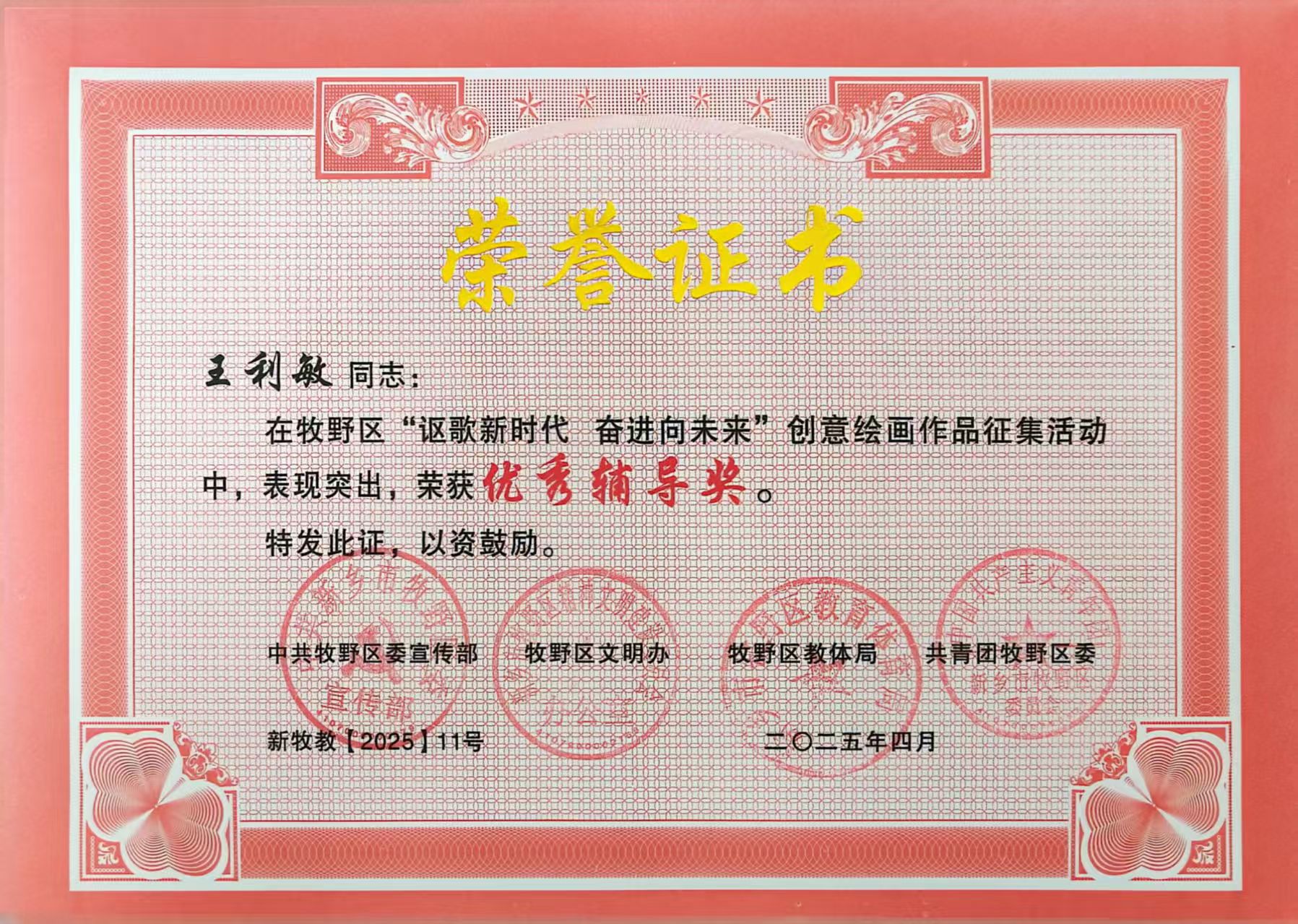 在牧野区“讴歌新时代 奋进向未来”创意绘画作品征集活动中,朱恩嘉、王嘉文、朱煜诚、何紫涵、张默语、李欣窈六位同学表现突出,荣获优秀奖,王利敏、赵静、赵逸璇、张晗、贾金凤、邹丽娜老师荣获优秀辅导奖。