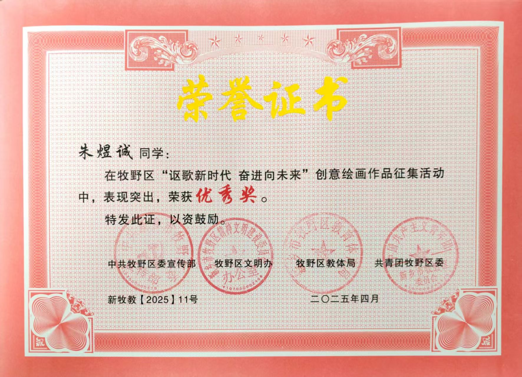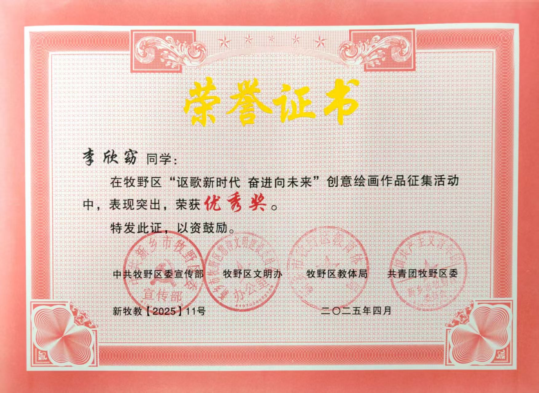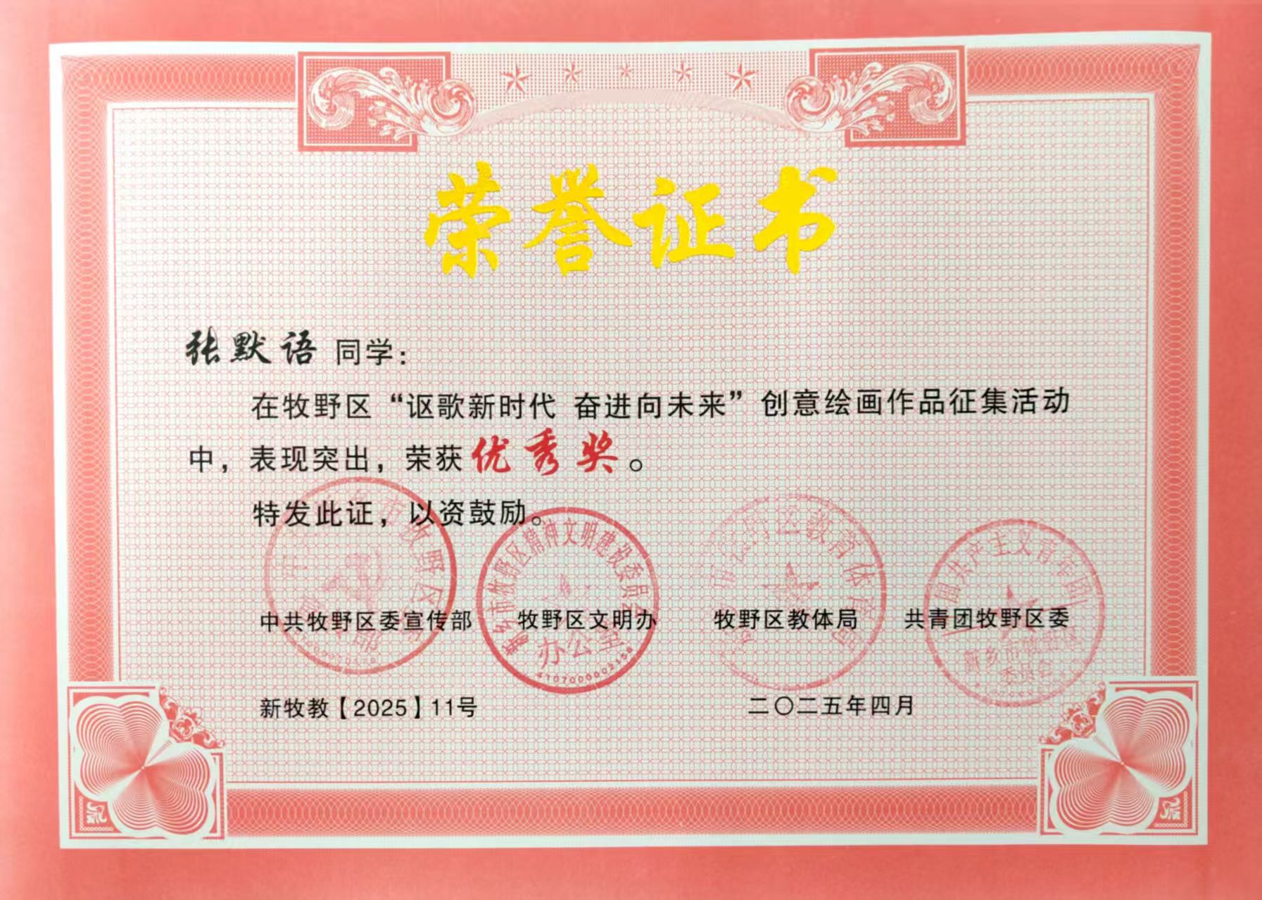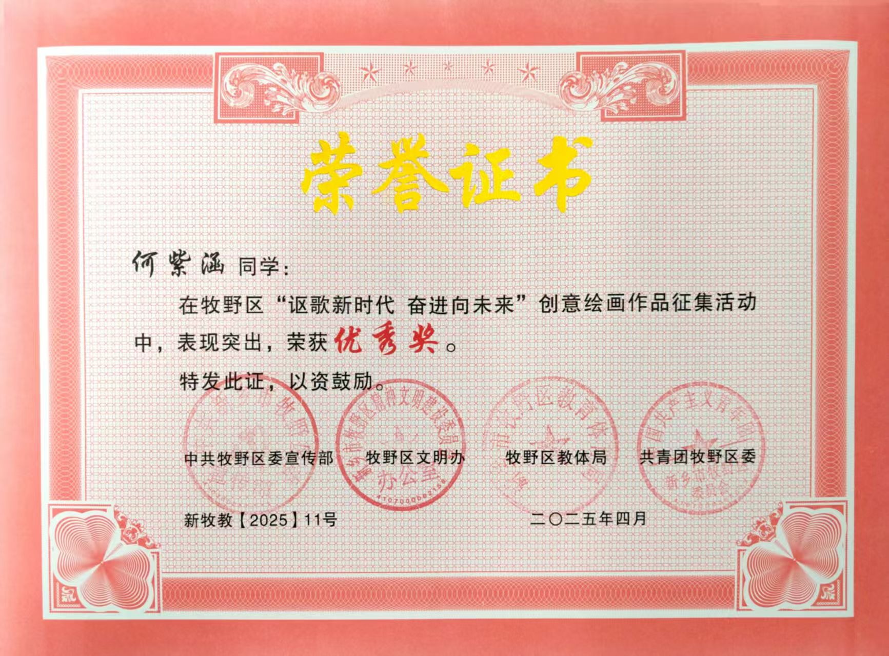 在牧野区“讴歌新时代 奋进向未来”创意绘画作品征集活动中,朱恩嘉、王嘉文、朱煜诚、何紫涵、张默语、李欣窈六位同学表现突出,荣获优秀奖,王利敏、赵静、赵逸璇、张晗、贾金凤、邹丽娜老师荣获优秀辅导奖。
