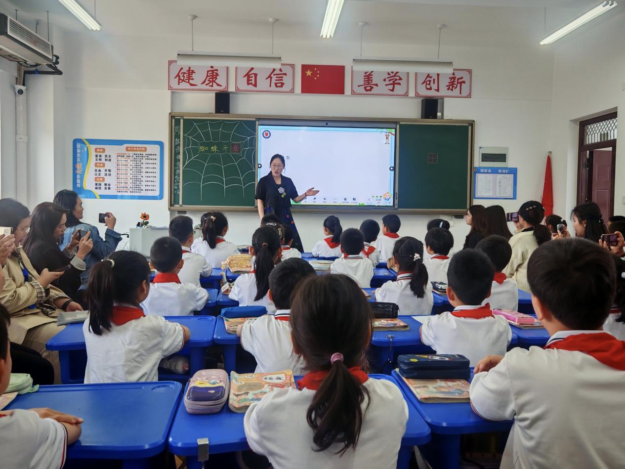 二(6)班赵逸璇老师执教的《蜘蛛开店》,在凸显多种识字方法的同时,将课文故事做成“蜘蛛网”思维导图,还巧妙地运用儿歌的韵律讲故事,孩子们学得有滋有味,乐在其中。泰国老师惊讶于多种识字法和讲故事的妙趣,教室里不时地发出赞叹声和会心的笑声。