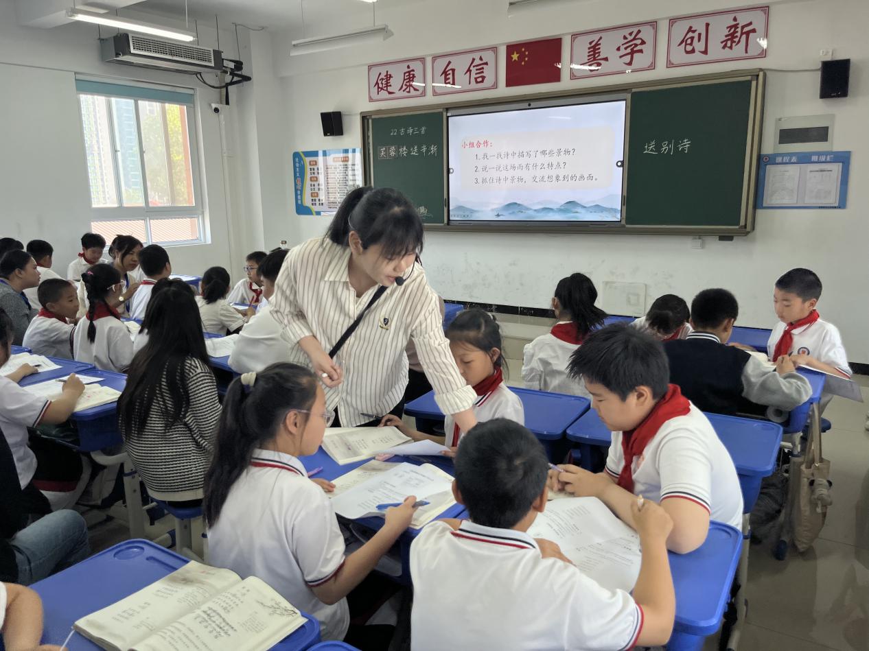 四(1)班杨爽老师的《芙蓉楼送辛渐》课堂,化作一幅流动的水墨长卷。简明的教学环节,清晰的学习任务,有效的学习指导,都让泰国老师连连称赞。更让他们沉醉的还有古诗中“送别”的意向表达,“饮酒相送、折柳相送、踏歌相送”,文化对话悄然发生。