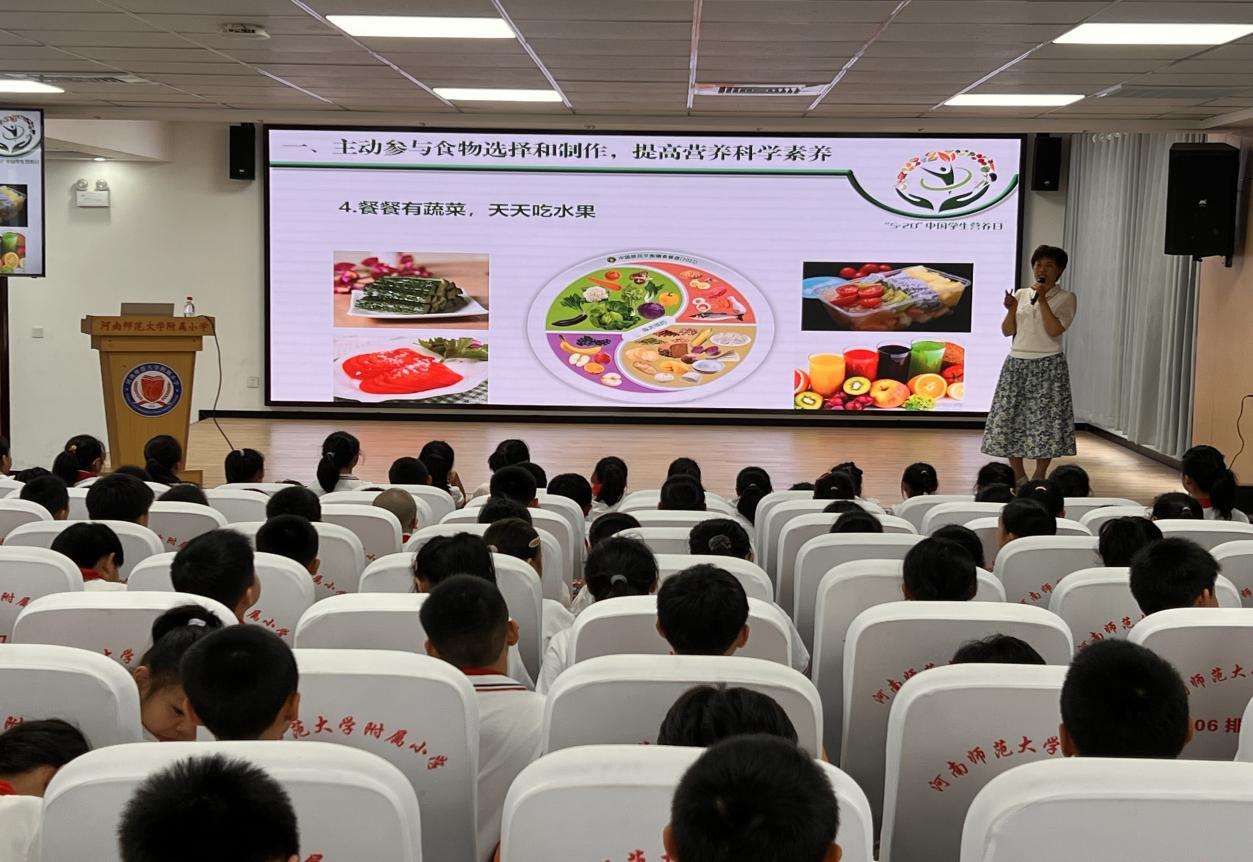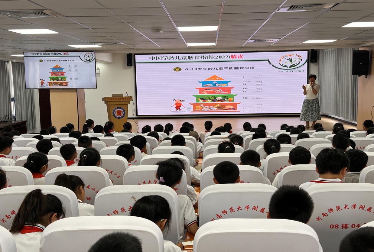 会议由副校长户婕主持,为了孩子们的健康,曹老师上午分别给三年级、四年级学生做了两次讲座。活动中,曹老师通过图文并茂的讲解向同学们介绍了食物的分类和《中国学龄儿童平衡膳食宝塔(2022版)》。同学们学习到每天应摄入12种以上食物,每周达到25种以上,并且要注重“粗细搭配、荤素搭配、深浅搭配”。曹老师还特别强调了早餐的重要性,一顿营养充足的早餐应包括谷薯类、肉蛋奶豆类和果蔬类食物。
