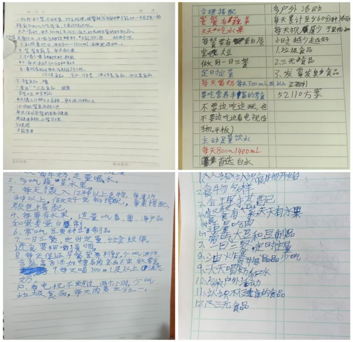 此外,曹老师还提醒同学们要远离不健康食品,如垃圾食品、三无食品和过期食品。为了预防肥胖,同学们应遵循“52110”原则:每天吃5个拳头大小的蔬菜和水果,使用电子产品不超过2小时,每天进行1小时以上运动,吃肉不超过1个手掌大小,不喝含糖饮料。