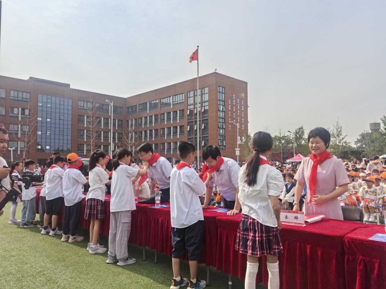 少先队员代表为各位领导、嘉宾系上鲜艳的红领巾