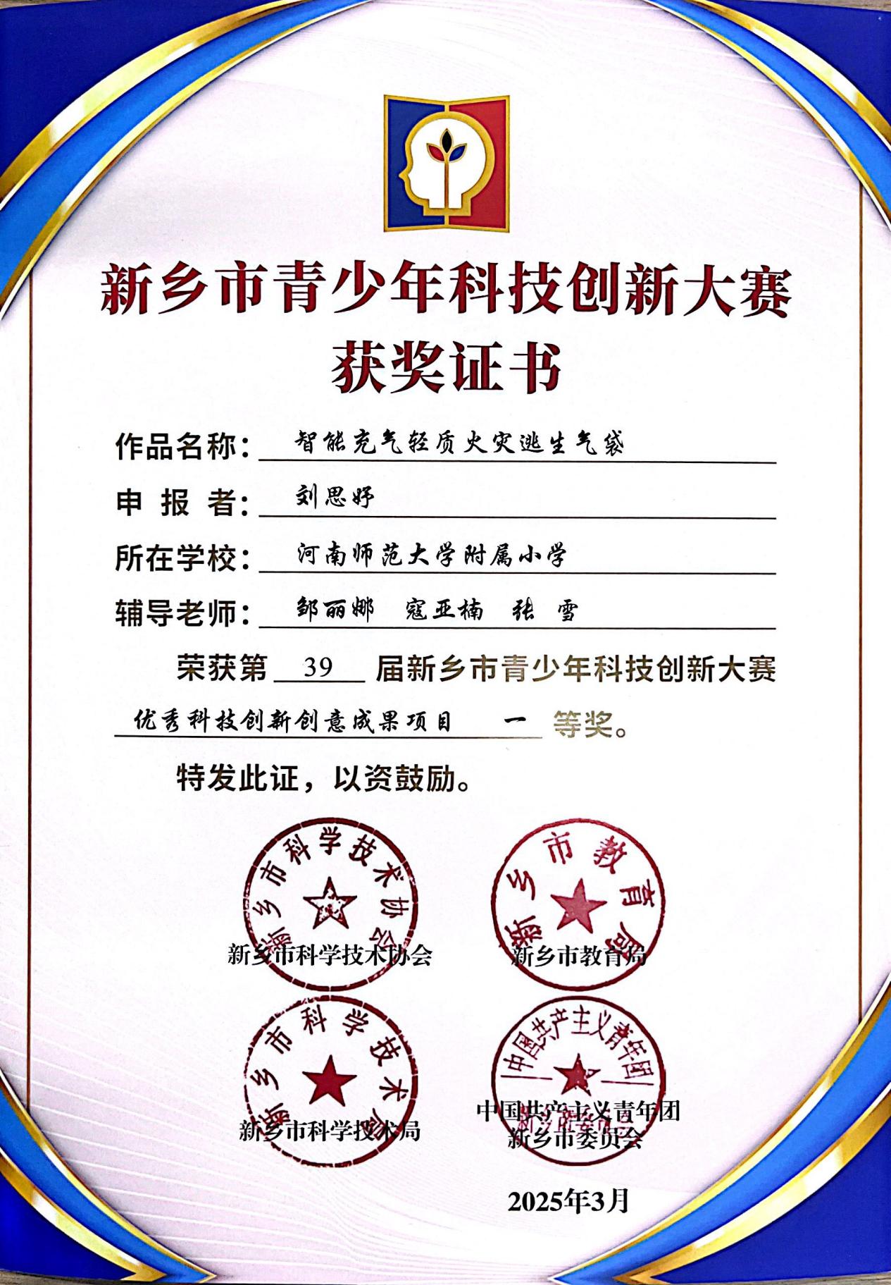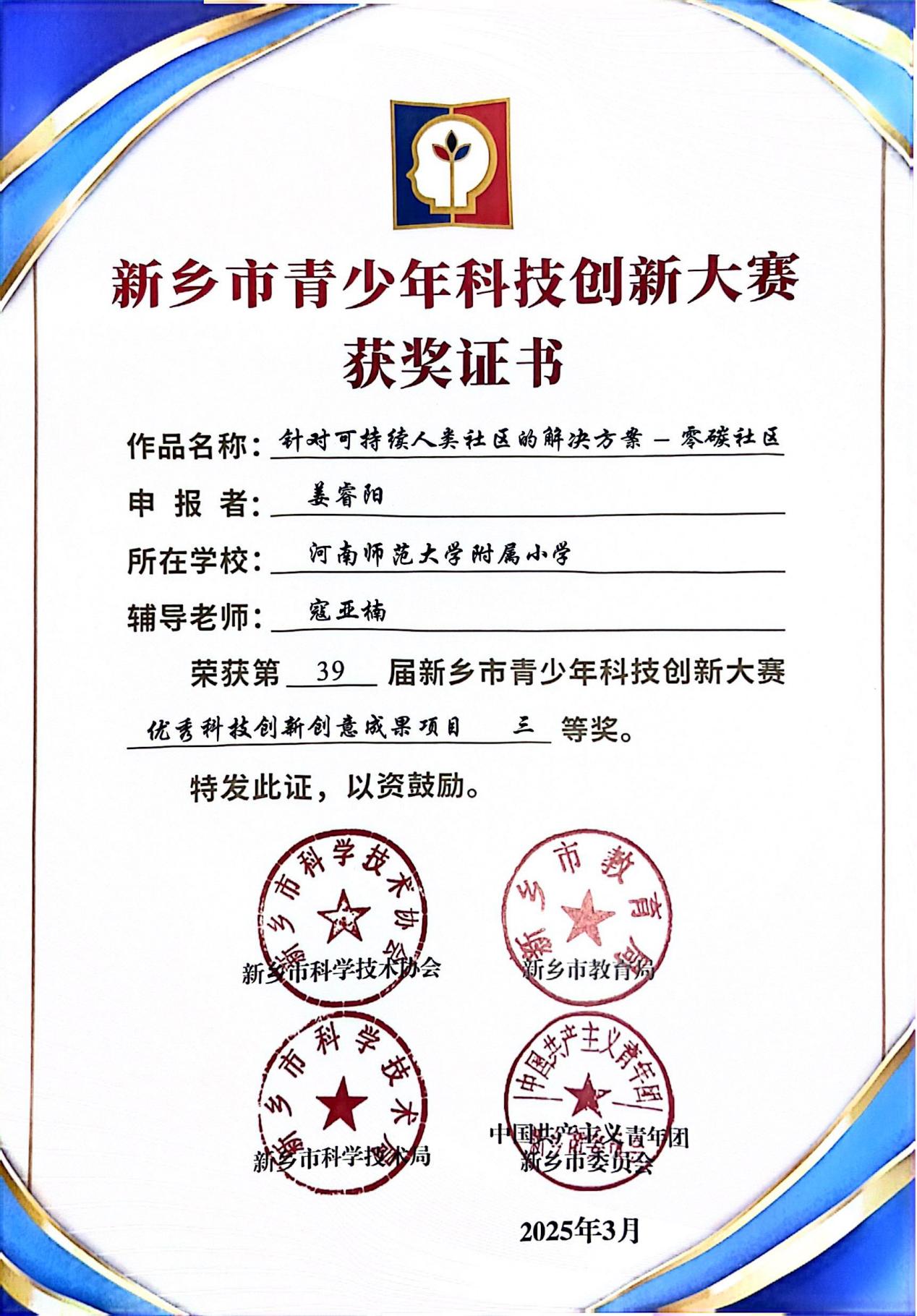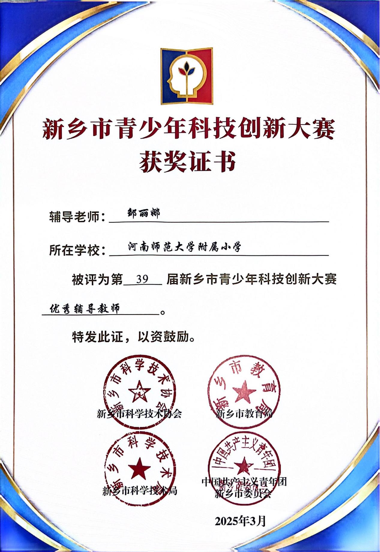 我校在第39届新乡市青少年科技创新大赛中成绩优异,多名学生荣获奖项。其中,刘思妤荣获一等奖,文彦博荣获二等奖,姜睿阳、宋佳霖、梁馨雅荣获三等奖。学生优异成绩的背后,离不开老师的辛勤付出,其中,寇亚楠、邹丽娜、张雪老师荣获优秀辅导教师奖。