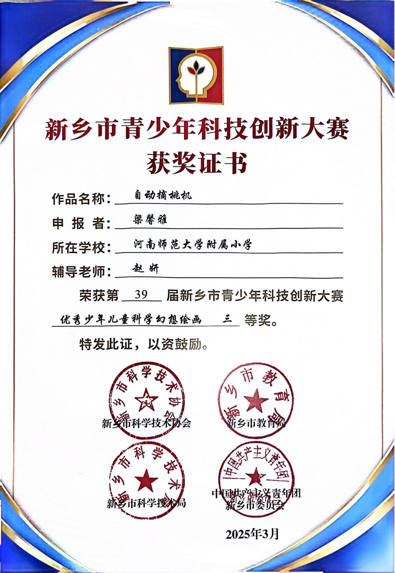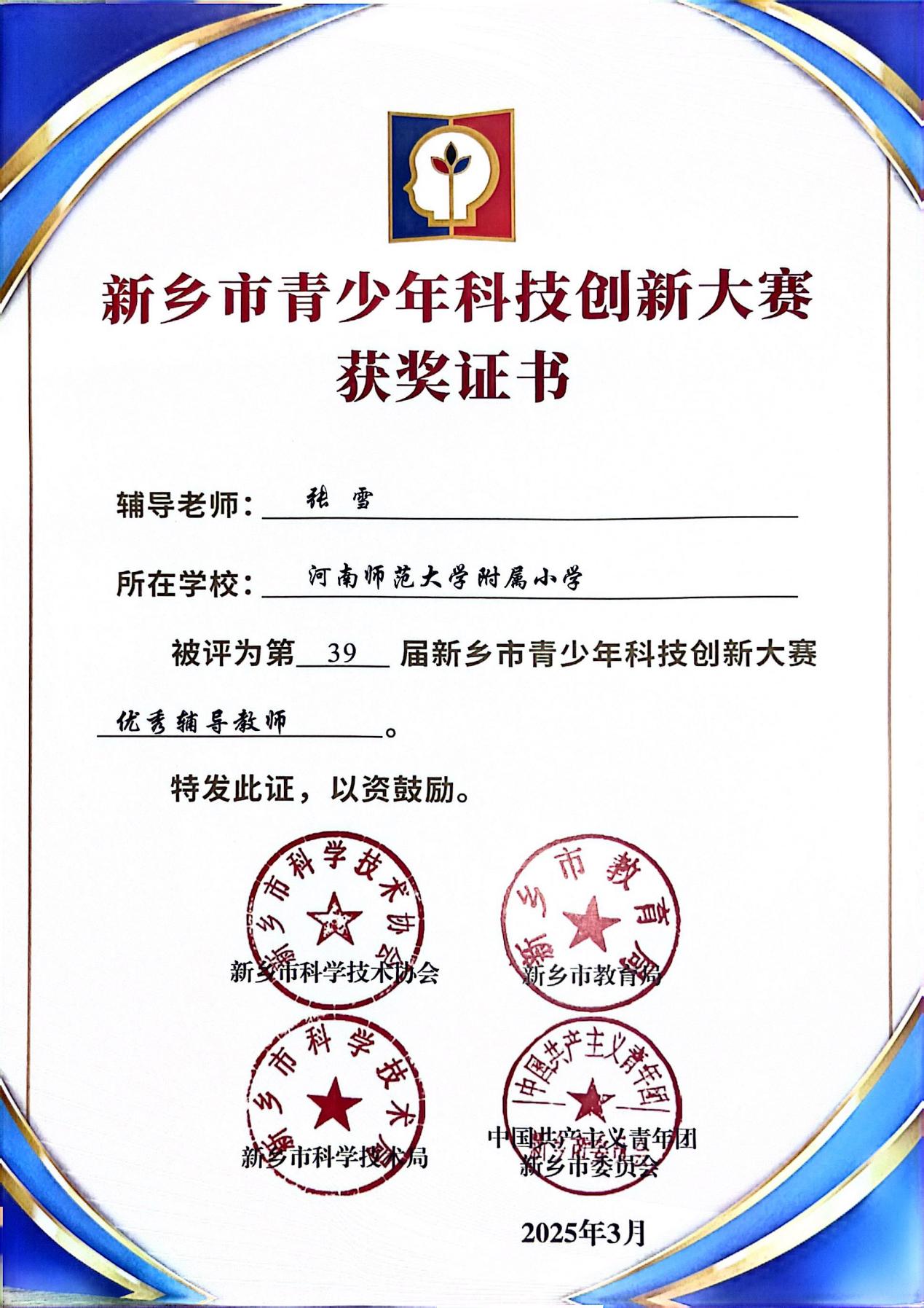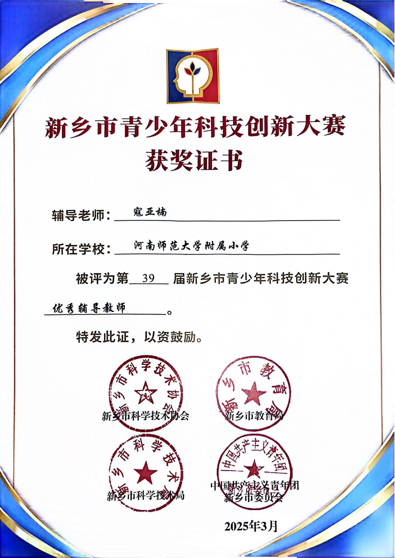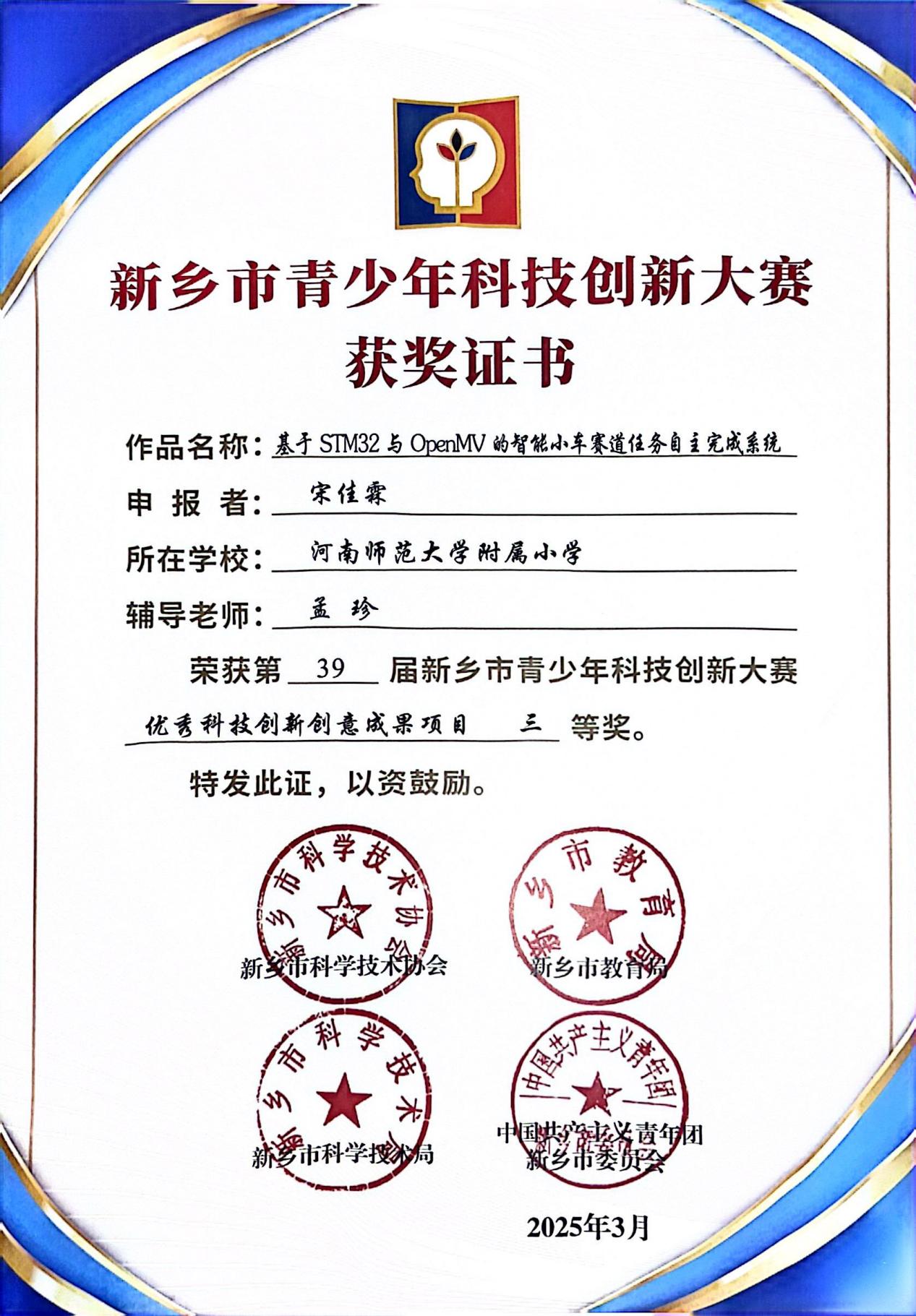 我校在第39届新乡市青少年科技创新大赛中成绩优异,多名学生荣获奖项。其中,刘思妤荣获一等奖,文彦博荣获二等奖,姜睿阳、宋佳霖、梁馨雅荣获三等奖。学生优异成绩的背后,离不开老师的辛勤付出,其中,寇亚楠、邹丽娜、张雪老师荣获优秀辅导教师奖。