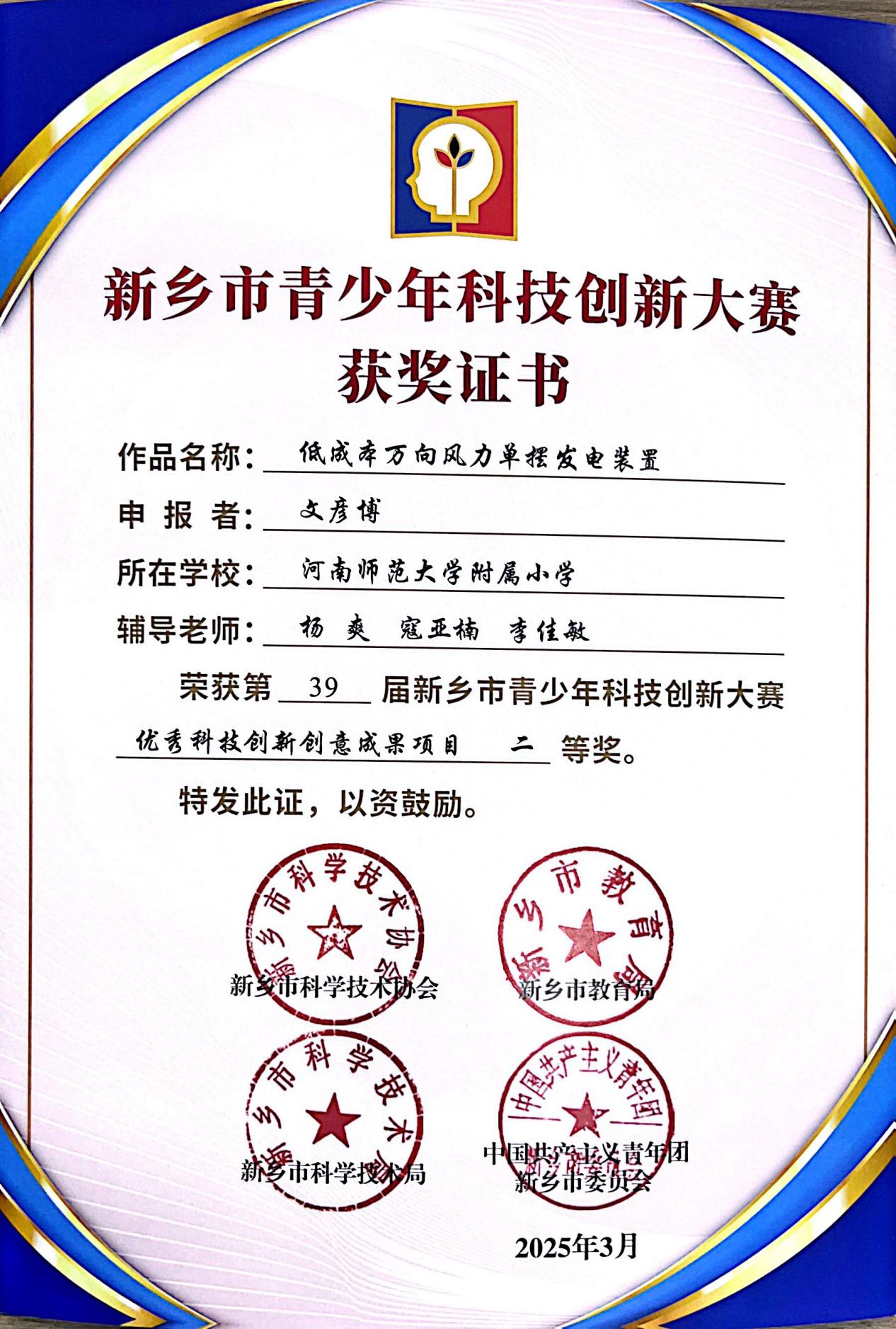 科学课程作为我校的特色课程之一,旨在培养学生的科技创新精神和实践能力。本次在新乡市青少年科技创新大赛中取得的显著成绩,充分展现了我校科学课程的育人成果,也为孩子们打开了通往奇妙科学世界的大门,让他们在科技的天空下茁壮成长,向着未来勇敢启航!