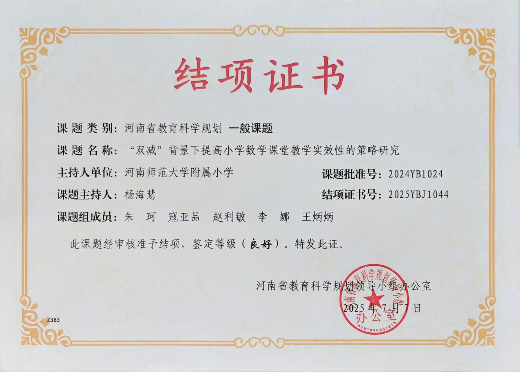 近日,由河南省教育厅组织的2025年度河南省教育科学规划课题结项评审结果正式公布。我校杨海慧老师主持的课题《“双减”背景下提高小学数学课堂教学实效性的策略研究》(课题批准号:2025YBJ1044)顺利通过结项验收,并获评“良好”等级。