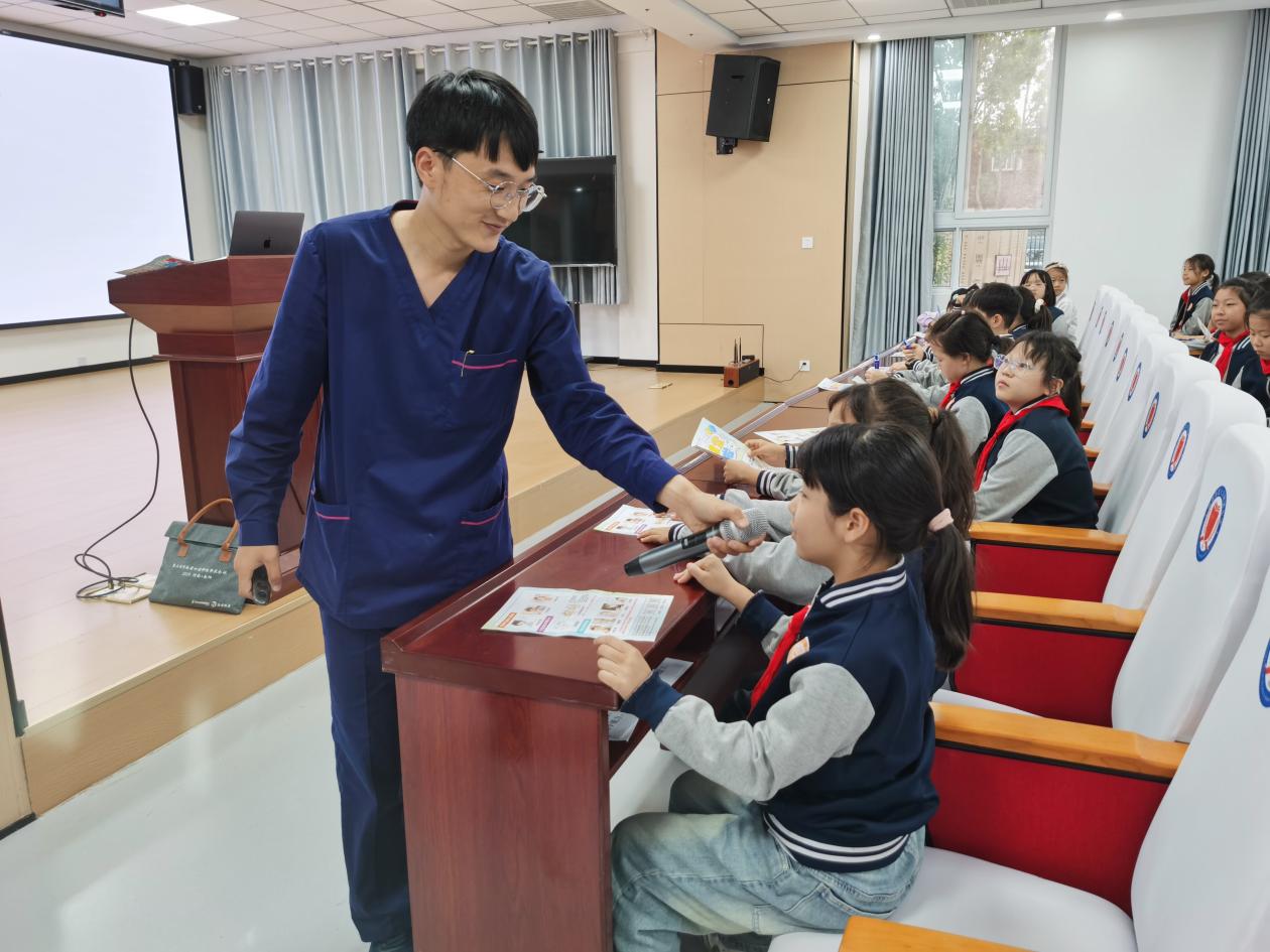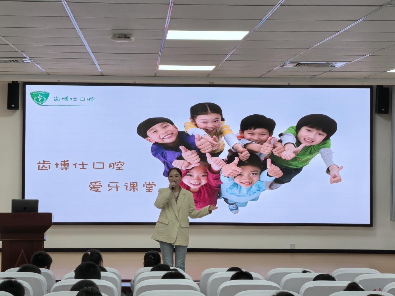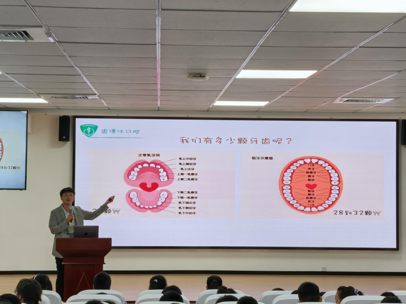讲座伊始,欧菲菲主任热情开场,用“大家知道我们的牙齿每天要‘工作’多久吗?”的趣味提问调动现场氛围,随后向学生们介绍主讲医生,正式开启本次健康知识分享。