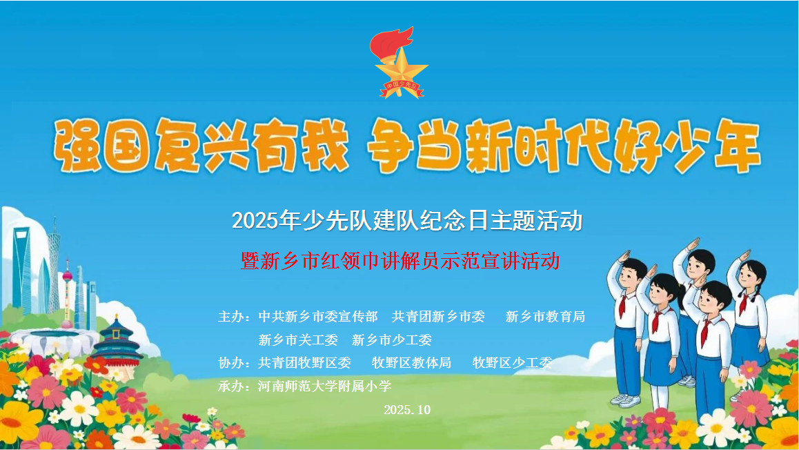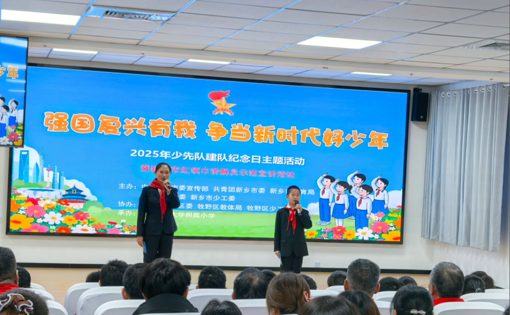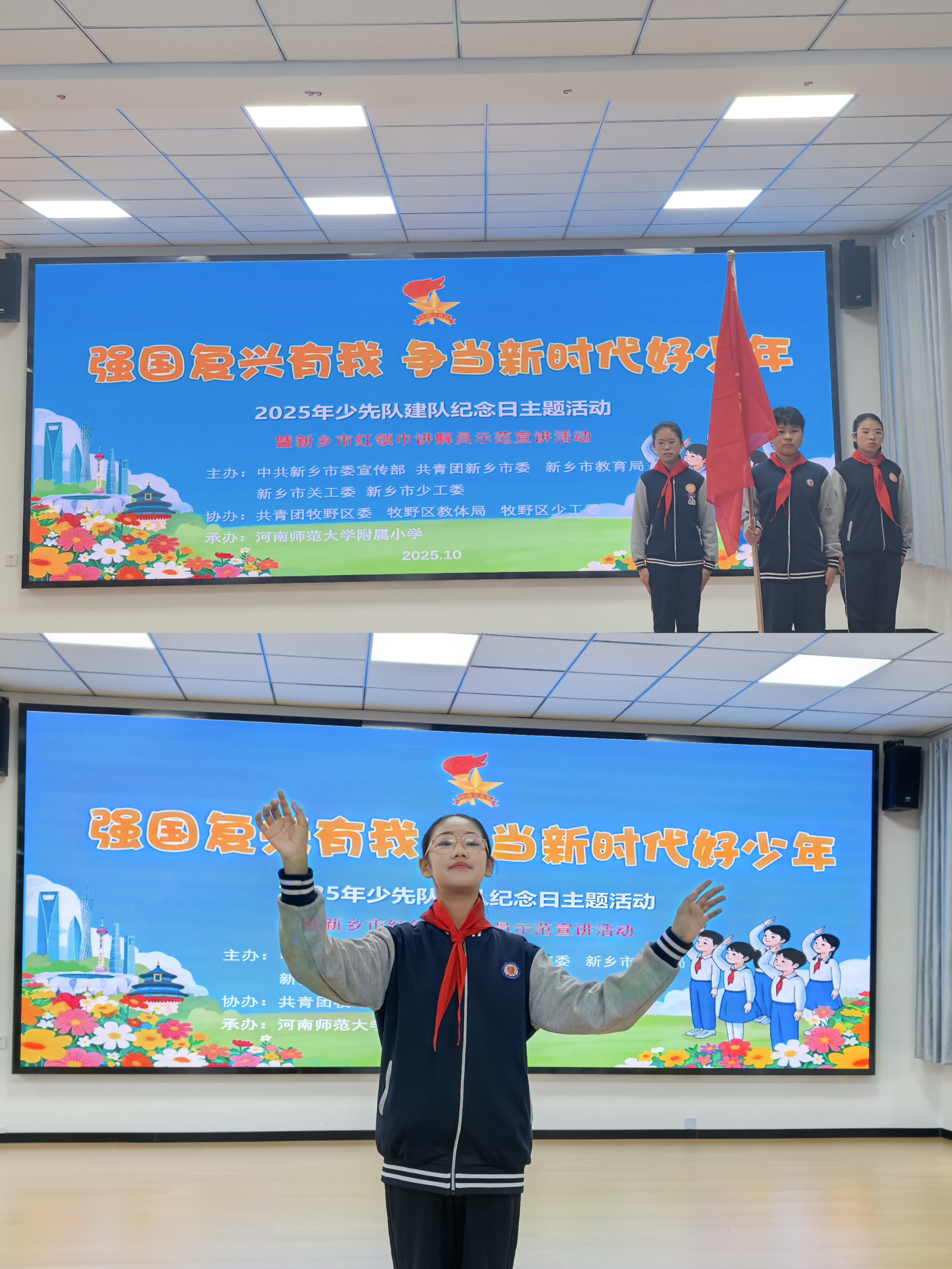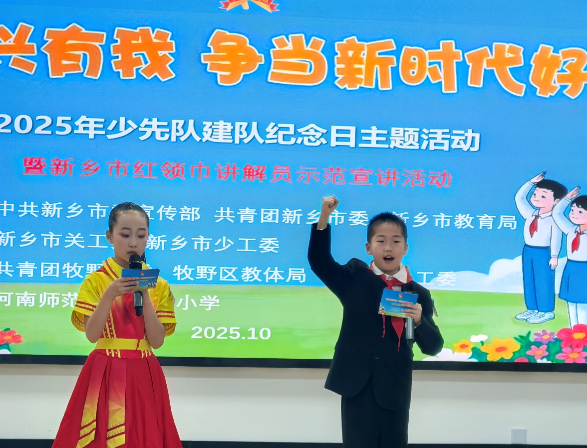 为深入贯彻习近平总书记关于少年儿童和少先队工作的重要论述,落实《中共中央关于全面加强新时代少先队工作的意见》要求。10月10日下午3点,在伟德官网下载苹果版附属小学举行了中国少年先锋队建队76周年纪念日暨红领巾讲解员示范宣讲活动。市关工委执行主任朱性福,团市委副书记、市少工委主任史跃东,市教育局党组成员、副局长、市少工委主任冯建等领导,以及来自全市各县(市、区)、市直属学校和牧野区直属学校的少先队辅导员代表与伟德官网下载苹果版附小师生齐聚一堂,共同参与此次活动。