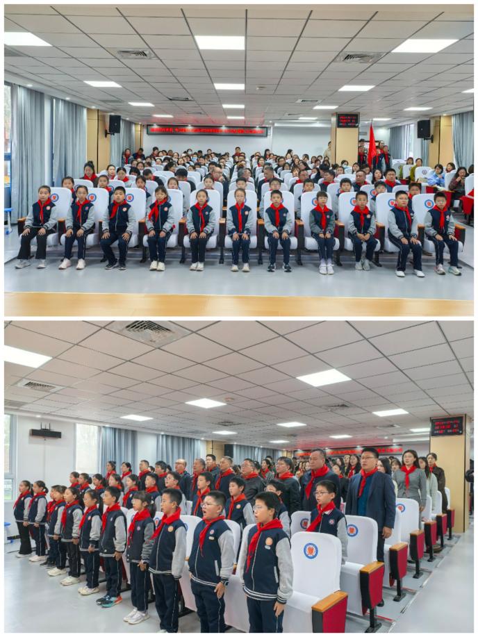 护旗手出旗,全体少先队员敬队礼,齐唱《我们是共产主义接班人》。