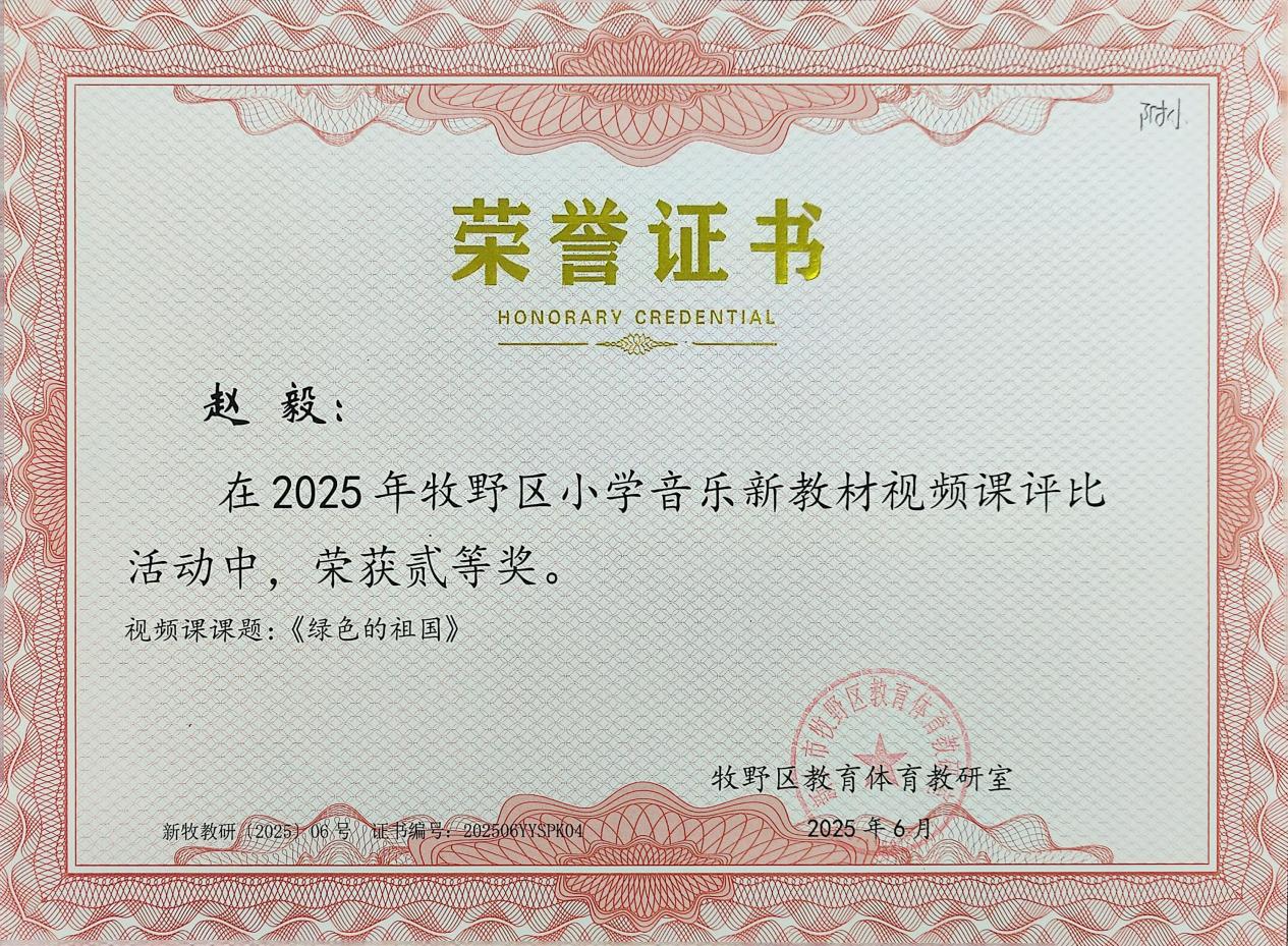 年牧野区小学音乐新教材视频课评比活动中,我校赵毅老师执教的《绿色的祖国》荣获二等奖。