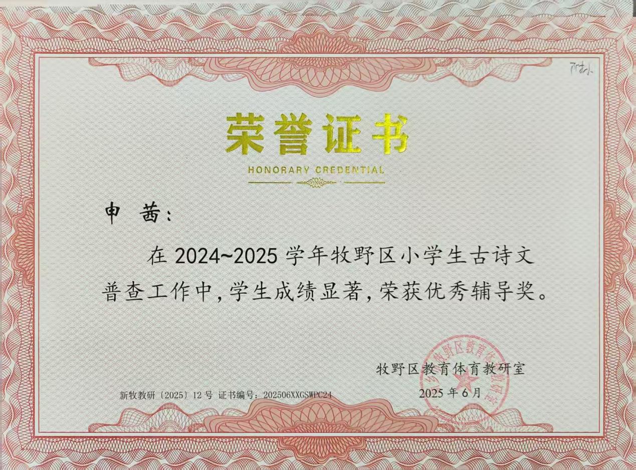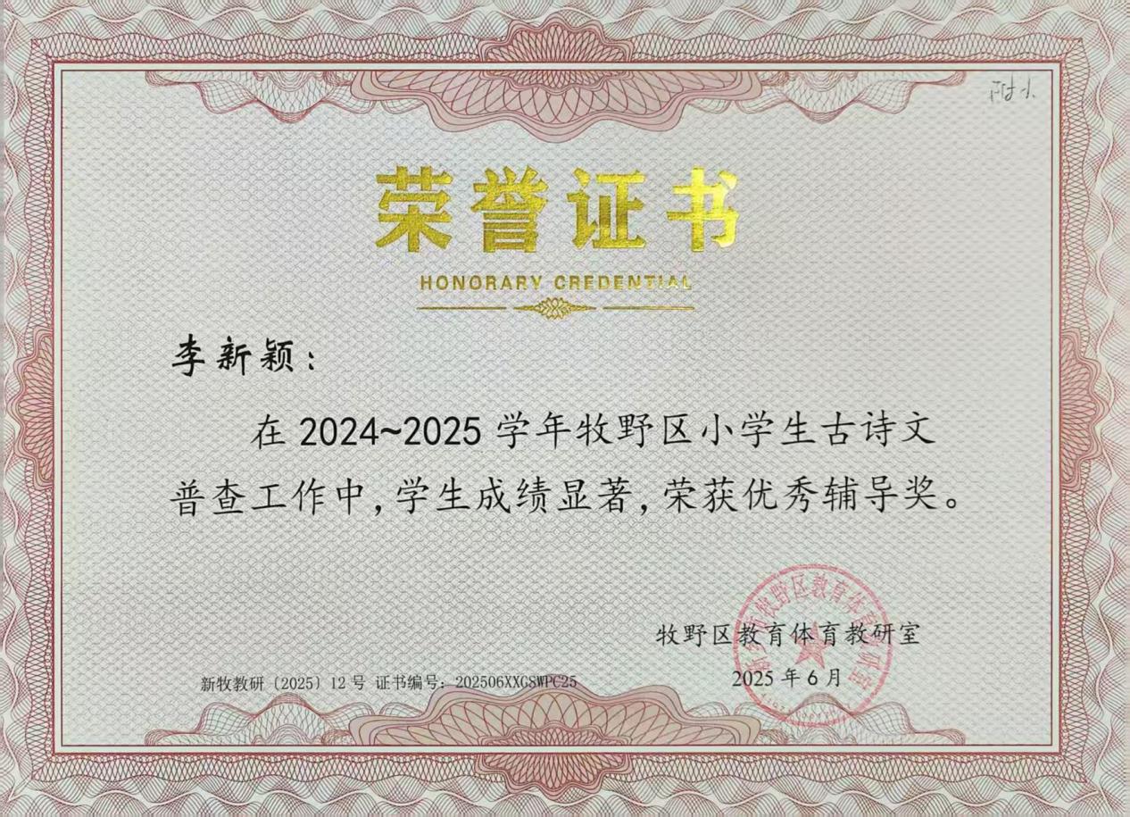 学年牧野区小学生古诗文普查工作中,我校学生表现突出,成绩显著,申茜、李新颖、王诗颖三位老师荣获优秀辅导奖。