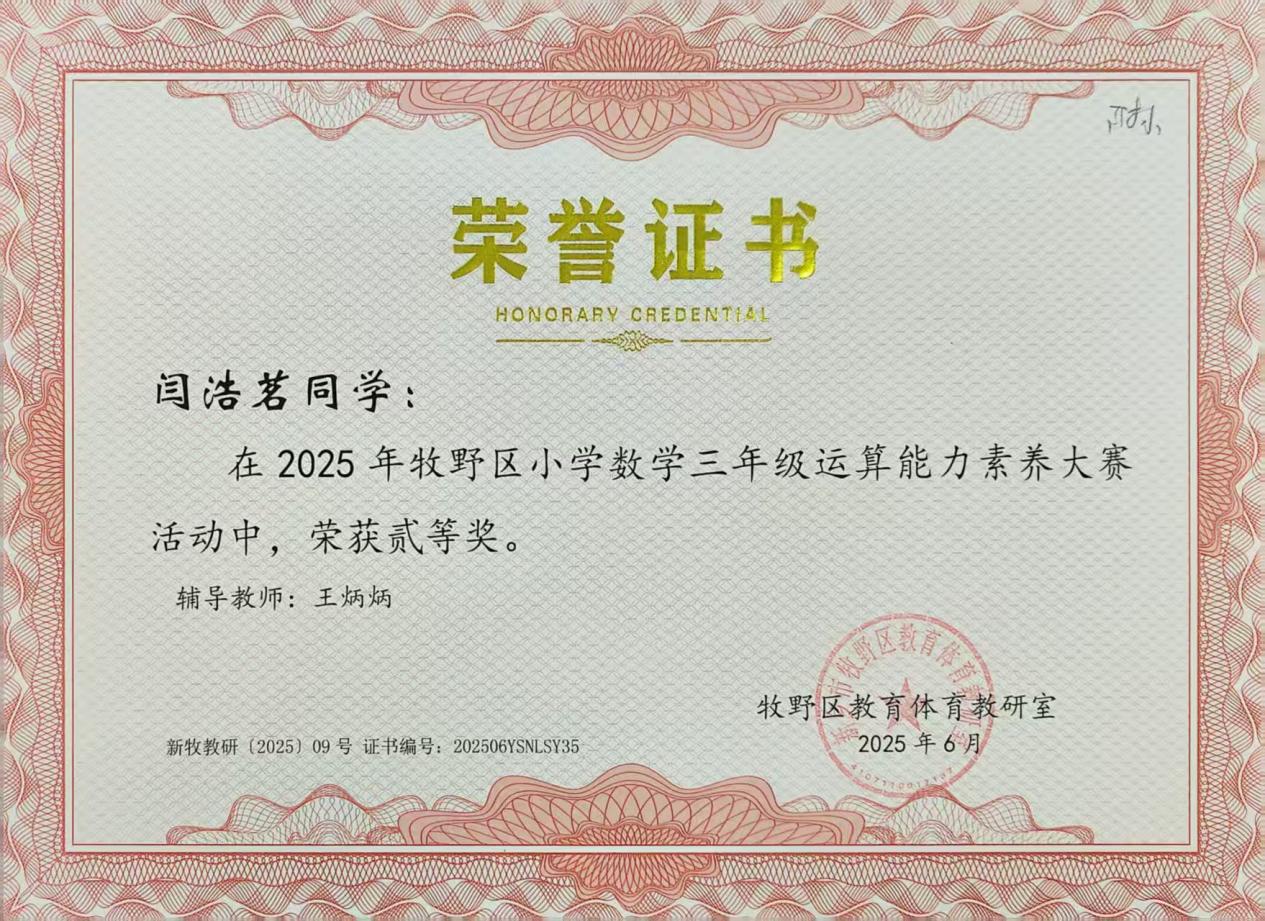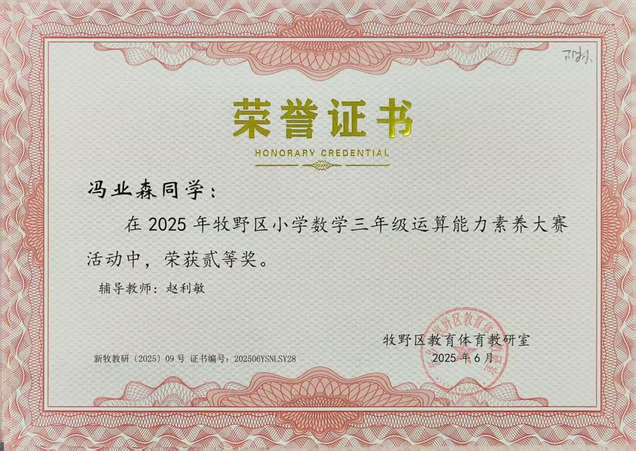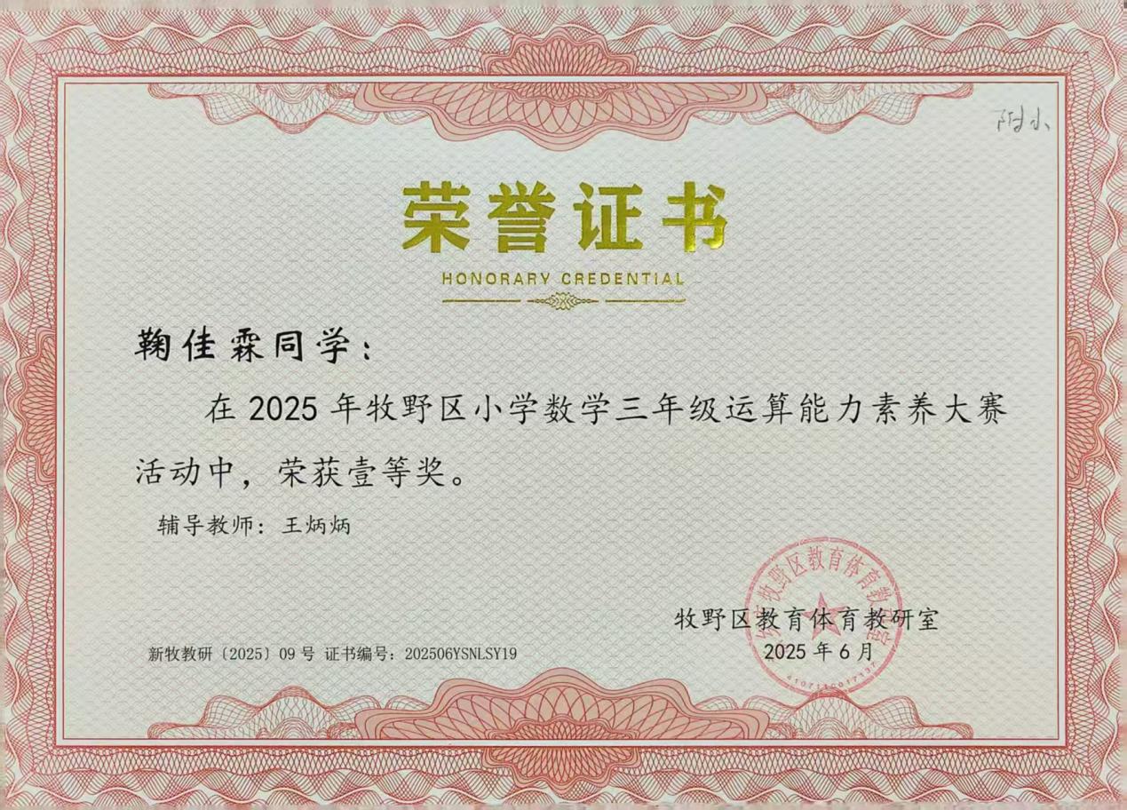 在2025年牧野区小学数学三年级运算能力素养大赛中,我校王炳炳老师辅导的鞠佳霖、闫浩茗分别荣获一、二等奖,赵利敏老师辅导的冯业森获得二等奖。