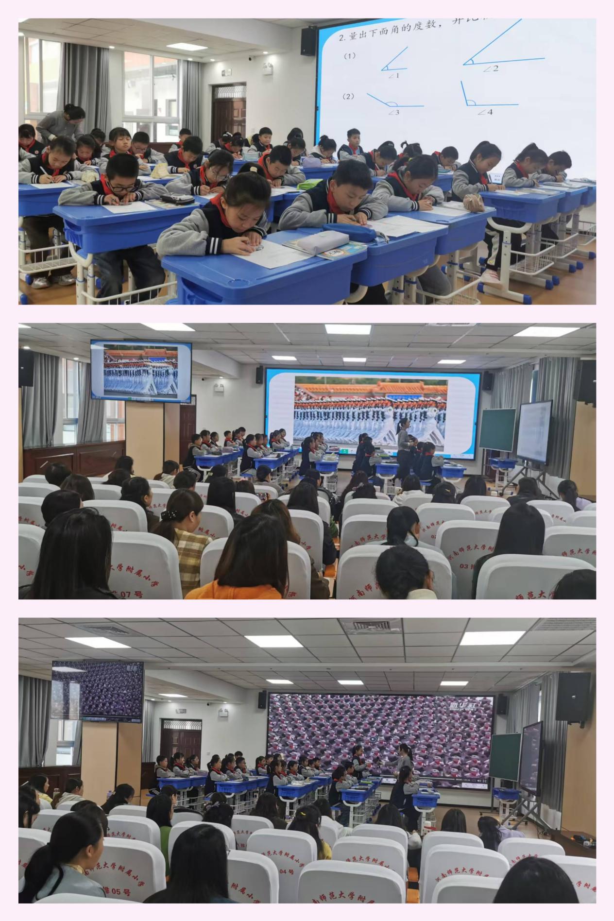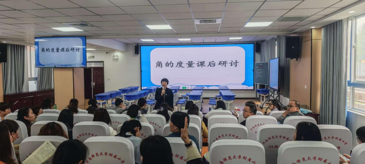 活动伊始,王炳炳老师与四(2)班学生共同呈现了一堂精彩的《角的度量》观摩课。课堂以阅兵仪式的真实情景切入,瞬间激发了学生的学习兴趣,自然引出课题。通过对比测量活动凸显统一度量标准的重要性,借助量角工具深化学生对度量原理的理解,最终落实量角器的规范使用技能。整节课以学生为中心,通过动手操作与探究思考,有效培育了学生的量感素养,充分体现了“教学评一致性”理念下的素养导向教学。