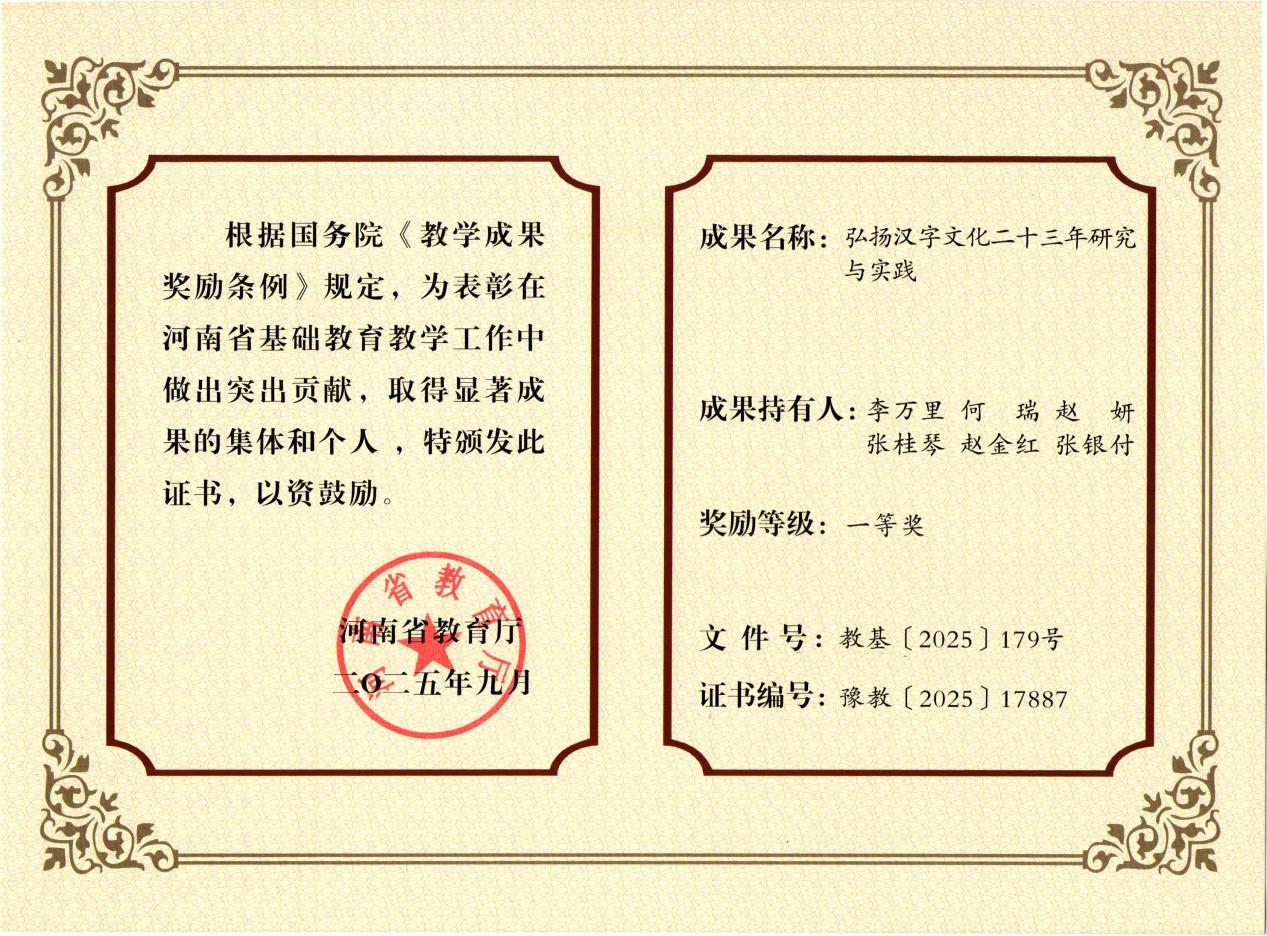 近日,河南省教育厅印发《关于公布2025年河南省基础教育教学成果奖评选结果的通知》(教基〔2025〕179号),附属小学两项教学成果从众多申报项目中脱颖而出,均获一等奖。其中,由该校教师李万里主持的《弘扬汉字文化二十三年研究与实践》,深耕汉字文化教育领域,历经二十三年探索形成特色教学模式;程乔夏参与的《中华优秀传统文化校本课程开发与教学实施十年探索研究》,聚焦校本课程建设,为传统文化进校园提供了可复制的实践经验。