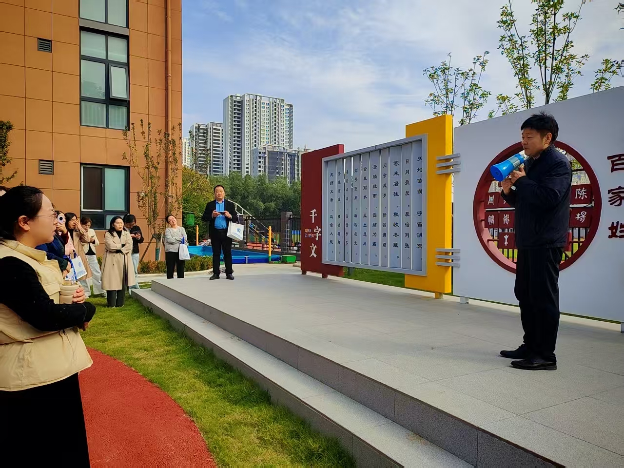 课间,李万里校长带领学员们参观了学校汉字文化园,细致讲解了校园文化建设中蕴含的思政元素,展示了我校在立德树人道路中的多元化探索。
