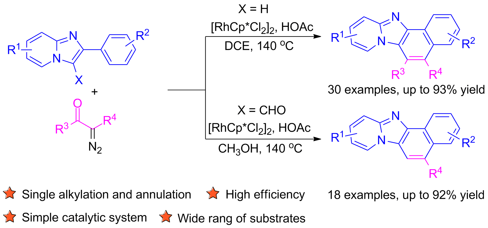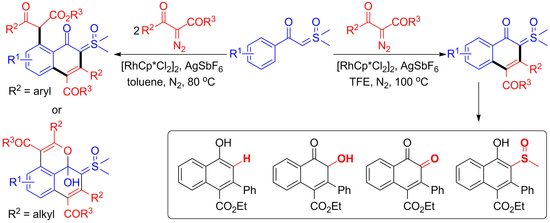 2). Xi Chen, Muhua Wang, Xinying Zhang*, and Xuesen Fan*. Rh(III)-Catalyzed Cascade Reactions of Sulfoxonium Ylides with α-Diazocarbonyl Compounds: An Access to Highly Functionalized Naphthalenones. Org. Lett., 2019, 21(8),2541-2545.