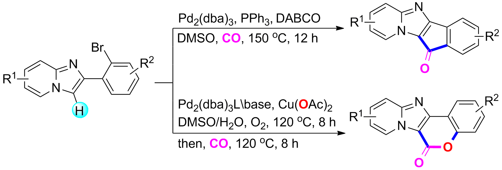 3). Ju Zhang, Xinying Zhang*,and Xuesen Fan*.Synthesis of Indeno[1′,2′:4,5]imidazo[1,2-a]pyridin-11-ones and Chromeno[4′,3′:4,5]imidazo[1,2-a]pyridin- 6-ones through Palladium-Catalyzed Cascade Reactions of 2-(2-Bromophenyl)imidazo[1,2-a]pyridines. J. Org. Chem., 2016, 81(8), 3206−3213.