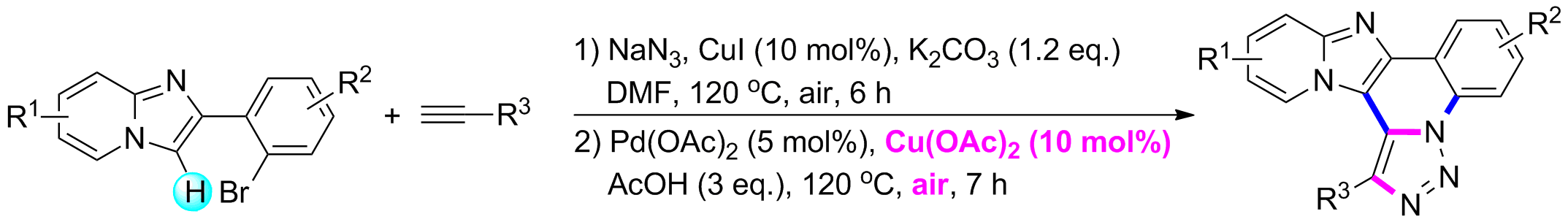 4). Ze Wang, Bin Li, Xinying Zhang, and Xuesen Fan*. One-Pot Cascade Reactions Leading to Pyrido[2′,1′:2,3]imidazo[4,5-c][1,2,3]triazolo[1,5-a] quinolines under Bimetallic Relay Catalysis with Air as the Oxidant. J. Org. Chem., 2016, 81(15), 6357−6363.