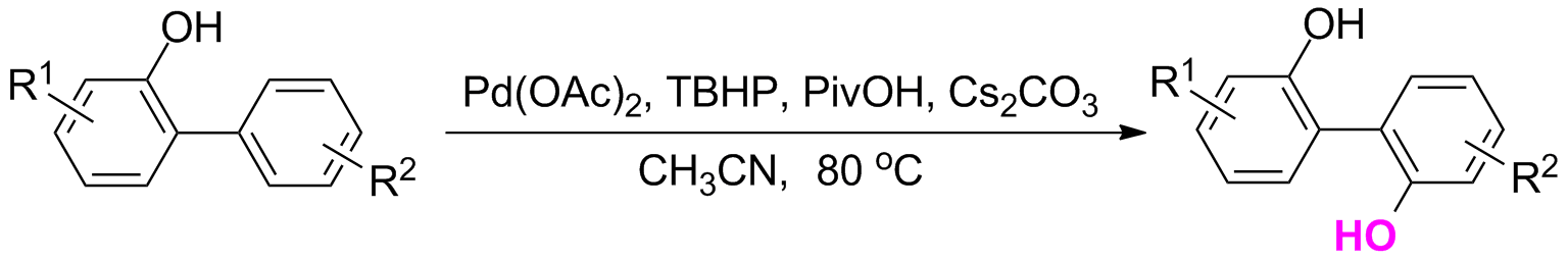 1). Shitao Duan, Yuanshuang Xu, Xinying Zhang* and Xuesen Fan*. Synthesis of 2,2’-biphenols through direct C(sp2)–H hydroxylation of [1,1’-biphenyl]-2-ols. Chem. Commun., 2016, 52(69), 10529-10532.