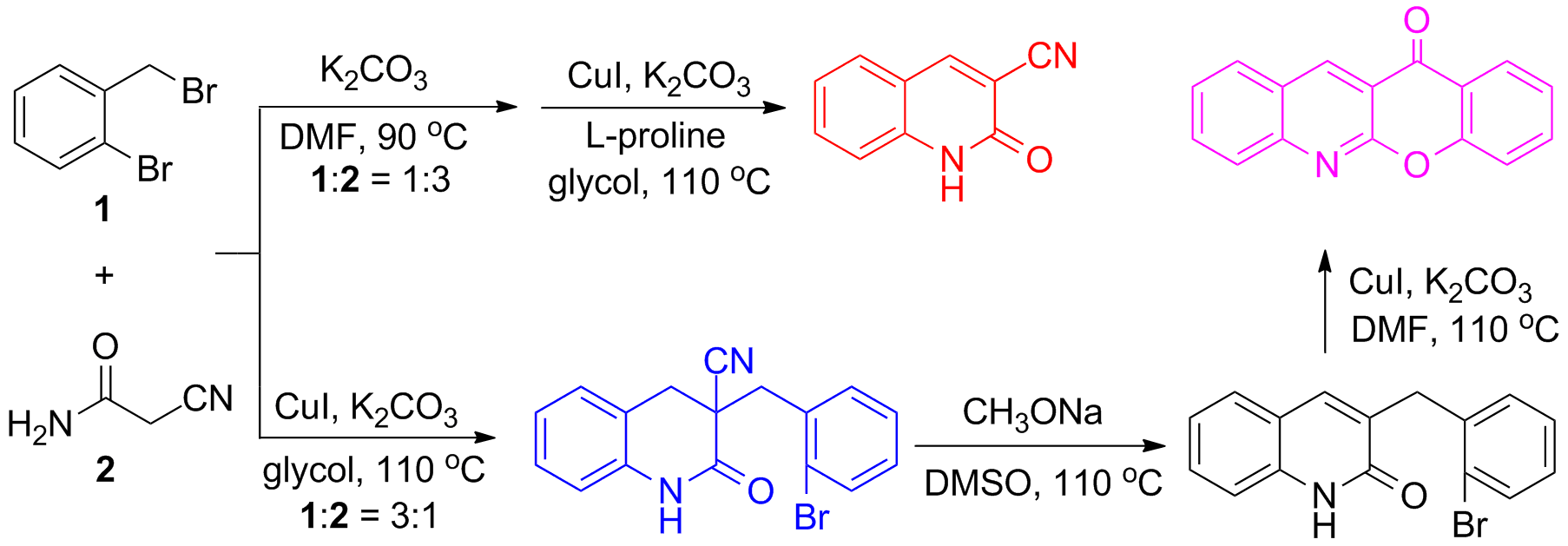 8) Xinying Zhang*, Xiaojie Guo, Liangliang Fang, Yunping Song, Xuesen Fan*. Copper-catalyzed N- and O-arylation of amides: alternative approaches to 3,4-dihydroquinolin-2-ones, quinolin-2-ones, and 12H-chromeno[2,3-b]quinolin-12-ones. Eur. J. Org. Chem., 2013, (36), 8087-8093.