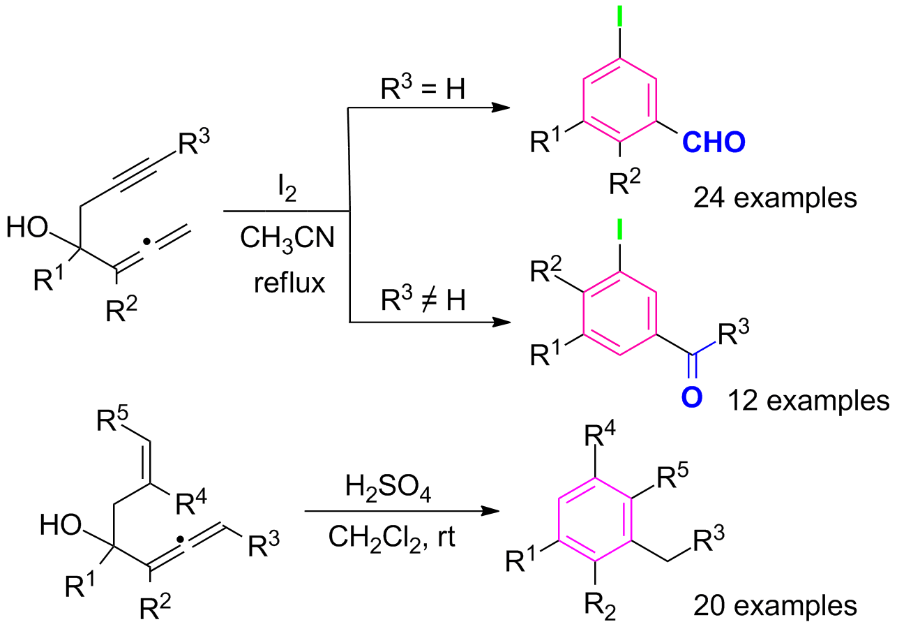 6) Yan He, Xinying Zhang*, Liangyan Cui, Xuesen Fan*. Iodine-initiated domino reaction of hepta-1,2- dien-6-yn-4-ols and brønsted acid promoted cyclization of hepta-1,2,6-trien-4-ols leading to functionalized benzenes. Chem. Asian J., 2013, 8(4), 717-722.