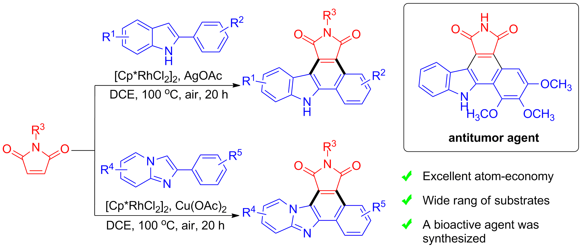 16) Bin Li,* Chenhao Guo, Nana Shen, Xinying Zhang, Xuesen Fan*. Synthesis of maleimide fused benzocarbazoles and imidazo[1,2-a]pyridines via rhodium(iii)-catalyzed [4+2] oxidative cycloaddition. Organic Chemistry Frontiers, Org. Chem. Front. 2020, 7(22), 3698-3704.
