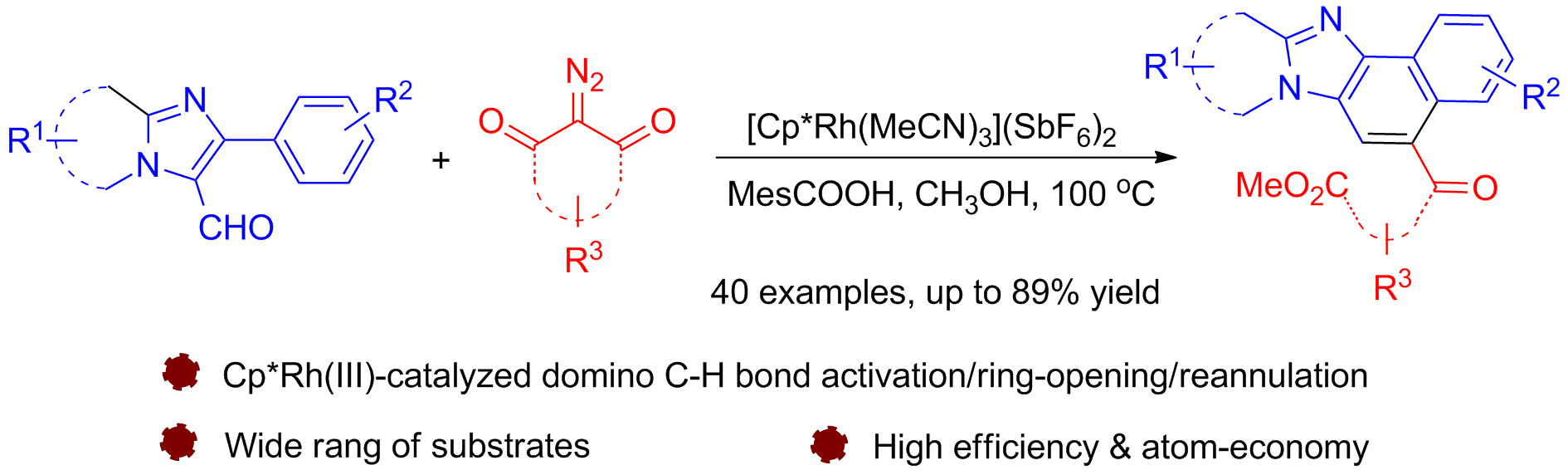 7) Bin Li,* Nana Shen, Yujie Yang, Xinying Zhang, Xuesen Fan*. Synthesis of naphtho[1 ',2 ':4,5]imidazo[1,2-a]pyridines via Rh(iii)-catalyzed C-H functionalization of 2-arylimidazo[1,2-a]pyridines with cyclic 2-diazo-1,3-diketones featuring with a ring opening and reannulation. Org. Chem. Front. 2020, 7, 919-925.