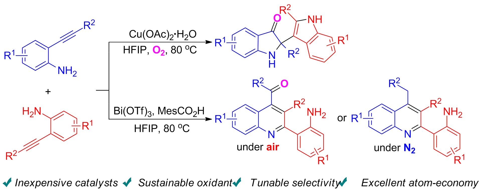 11) Ruixue Jia, Bin Li,* Xinying Zhang, Xuesen Fan*. Selective Synthesis of 2-Indolyl-3-oxoindolines or 2-(2-Aminophenyl)quinolines through Cu(II)- or Bi(III)-Catalyzed Tunable Dimerizations of 2-Alkynylanilines. Org. Lett. 2020, 22(17), 6810-6815.
