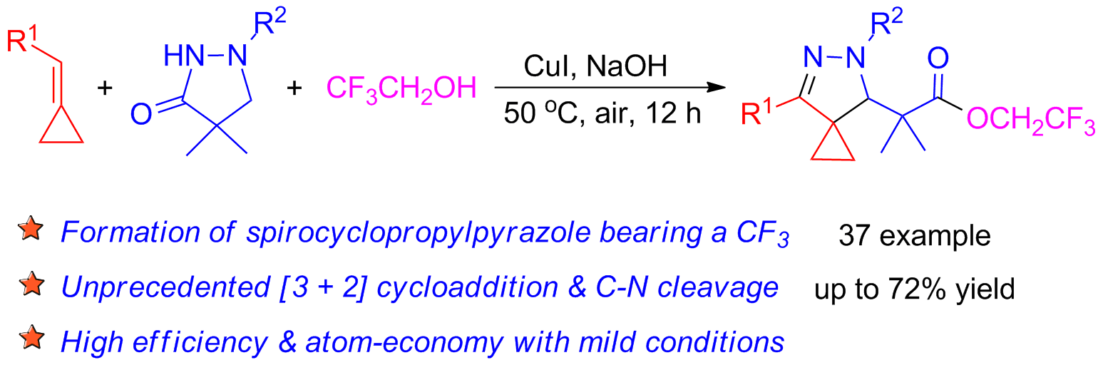 1) Mengyang Shen, Yuanshuang Xu, Xinying Zhang,* and Xuesen Fan.* Synthesis of spirocyclopropylpyrazole derivatives via the cascade reaction of alkylidenecyclopropanes with pyrazolidinones and trifluoroethanol. Org. Chem. Front. 2022, 9(5), 1410-1416.