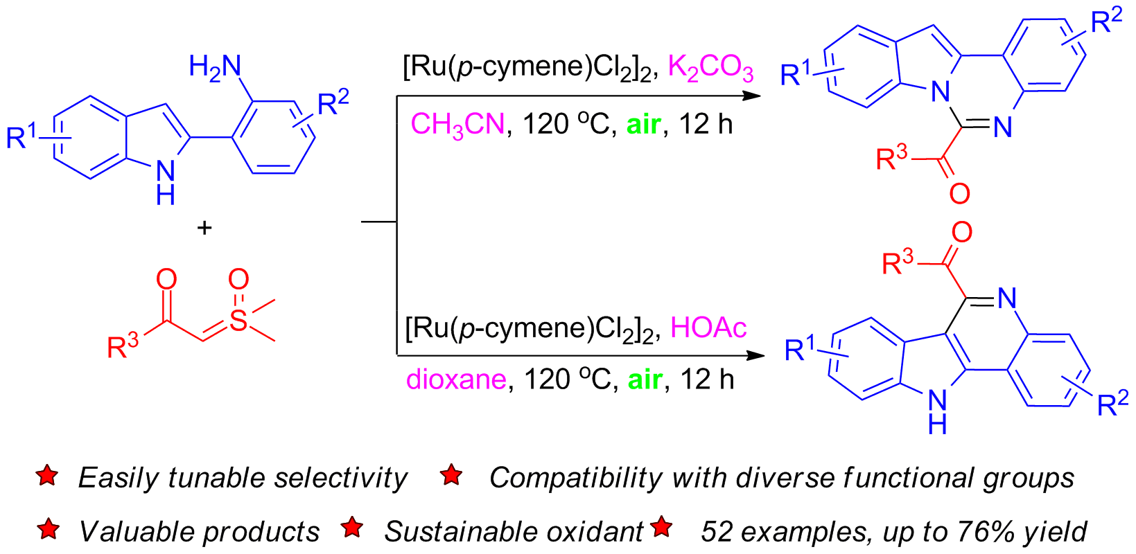 5) Guang Chen, Xinyuan Cai, Xinying Zhang*, and Xuesen Fan.* Condition-Dependent Selective Synthesis of Indolo[1,2-c]quinazolines and Indolo[3,2-c]quinolines from and Sulfoxonium Ylides. J. Org. Chem. 2022, 87 (15), 9815-9828.