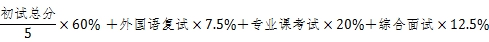 法律专业学位复试成绩占总成绩的40%,其中外国语复试7.5%,专业课考试20%,综合面试12.5%,总成绩计算公式为: