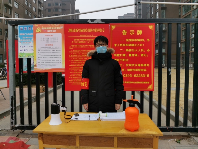 当看到当地相关部门发布的疫情防控志愿者招募公告时,他便主动写下请愿书,申请加入当地疫情防控志愿工作队伍,2月6日正式到就近防疫卡口开展志愿工作。他所在的社区居住人口较多,疫情防控工作繁杂,但他并无怨言,积极配合社区疫情防控人员完成体温检测及人员出入登记工作,并利用专业所学,建立社区疫情防控微信群、制作打卡小程序,方便疫情防控期间复工复产人员出入。除日常疫情防控工作外,他还深入社区排查留观住户,在入户调查中,他认真登记老人居住信息,定期回访,了解住户生活所需,帮助居民购买药品和生活必需品,赢得了社区居民的一致好评。