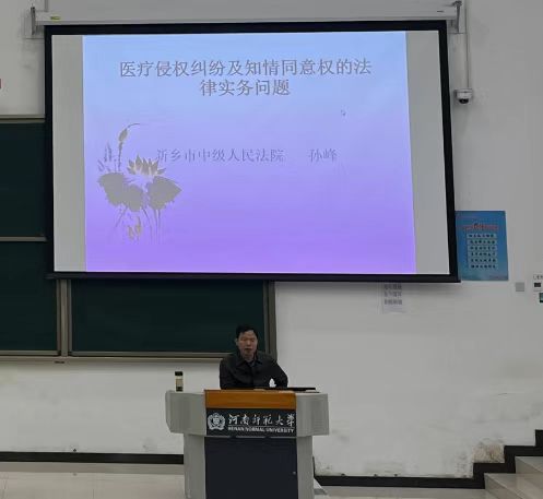为帮助同学们更好了解医疗侵权纠纷及知情同意权有关审判实务问题,2023年4月4日,我院邀请到新乡市中级人民法院民事审判第四庭孙峰副庭长为我院授课。