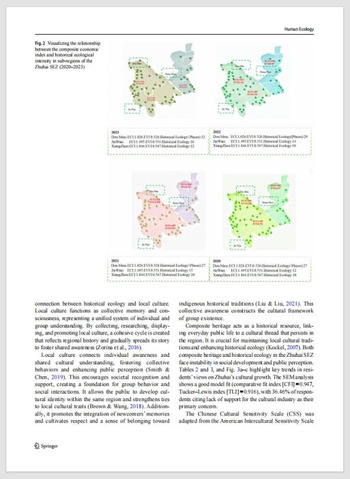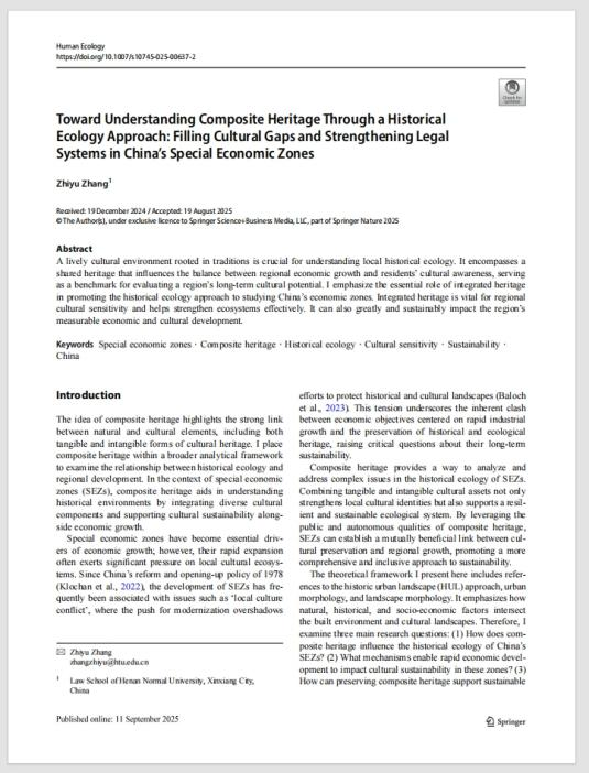 我院教师张值瑜近期在美国环境与人文科学领域期刊《人文生态学》(SSCI与SCI双检索,JCR一区)发表题为《历史生态学视域下的复合遗产治理:中国经济特区的文化重构与法治化路径探究》的论文。该研究立足于历史生态学的理论框架,探究中国经济特区中历史生态脉络与环境法治机制的互构关系,旨在通过跨学科视角揭示复合遗产治理的内在逻辑,并提出推动文化高质量与可持续发展的系统化制度保障与法治实践路径。此项研究不仅拓展了经济特区文化政策与环境法治交叉研究的新视野,也为我院在该前沿领域的学术积累与创新提供了重要支撑。