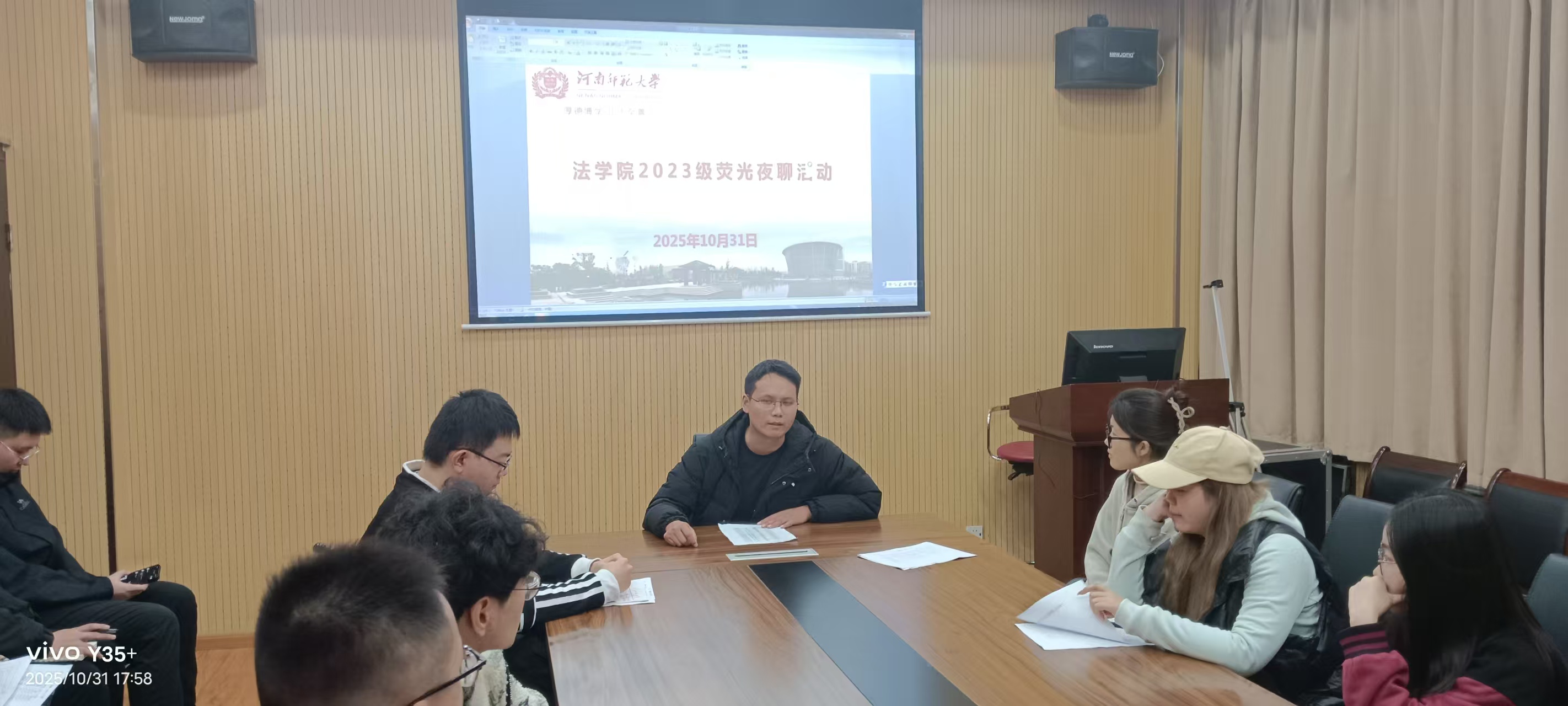 10月31日晚,我院在崇法楼303教室成功举办“荧光夜聊”师生交流座谈会。2023级辅导员杨俊与学生代表围坐交流,围绕校园生活适应、学业发展与个人成长等话题展开深入讨论,现场气氛温馨融洽。