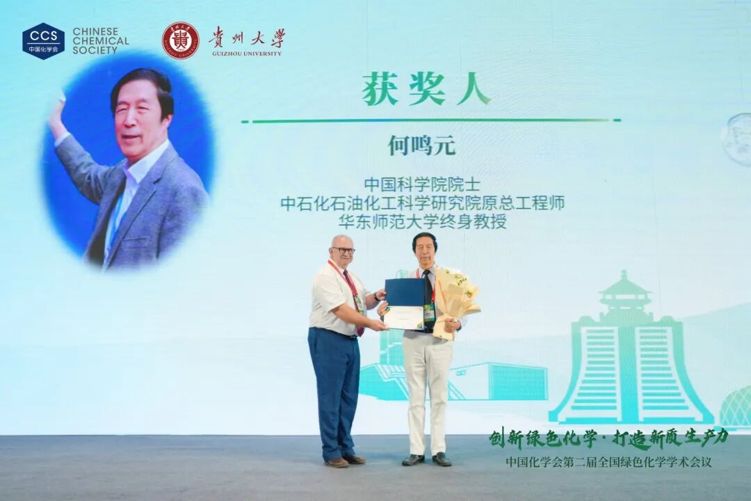 2025年9月6日,中国化学会第二届全国绿色化学学术会议在贵州省贵阳市开幕。开幕式上,法国化学会代表、法国国家科学研究中心Yves Queneau研究员向华东师范大学何鸣元院士颁发了“2023年度中法化学讲座奖”(China-France Chemistry Lectureship Award 2023)获奖证书。在致辞环节中,Yves Queneau研究员向何鸣元院士在科学研究和推动中法合作方面的卓越贡献表达崇高敬意。他同时感谢中国化学会和大会组委会的盛情邀请,并回顾了法国化学会与中国化学会多年来一直保持的紧密而友好的合作关系。