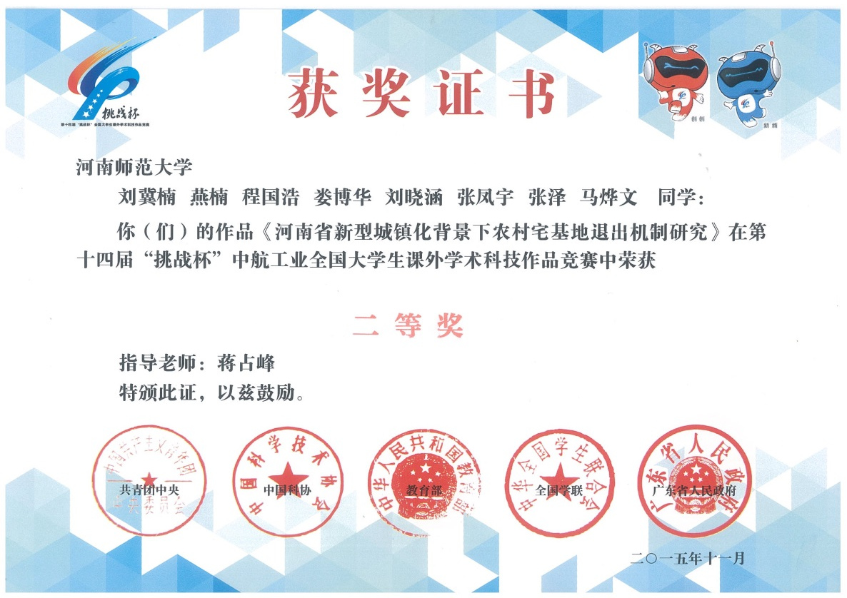 自2015年3月至11月,由社会事业学院刘冀楠、娄博华等人主要参与的《河南省新型城镇化背景下农村宅基地退出机制研究——以410名河南籍农民工为例》项目先后通过在河南省6个地市实地走访调研,与专家教授进行交流研讨,经院级、校级、省级层层选拔,顺利入围第十四届“挑战杯”全国大学生课外学术科技作品竞赛现场终审决赛,并于11月20日在广州荣获国家二等奖(河南省共8件作品)。与此,娄博华同学受邀赴港参加国际大学生创新创业峰会。
