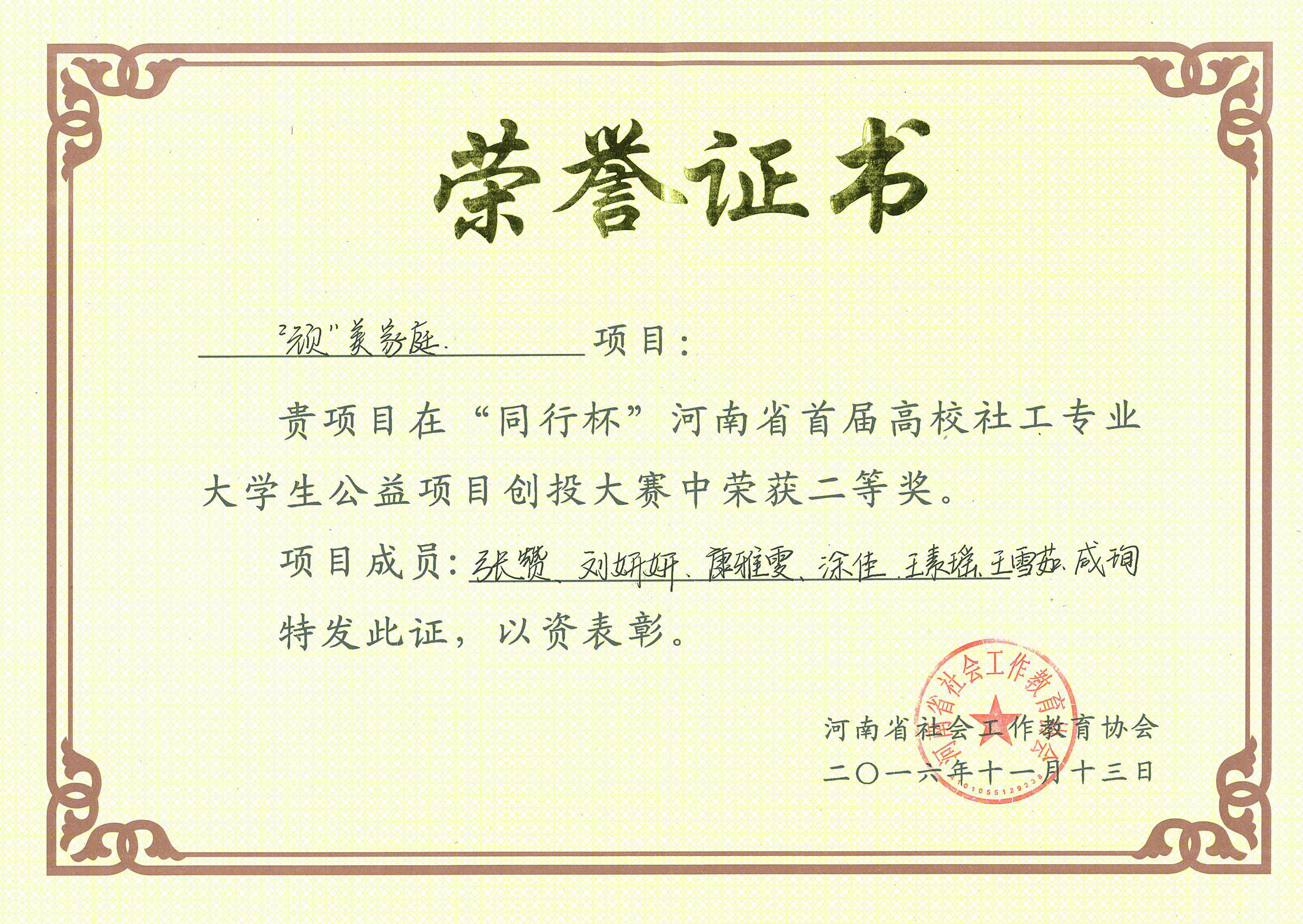 博学笃行、心系社会、求证公平、助人有道。我院学生代表队参赛项目《爱德社区养老服务机构》获2016年“创青春”河南省大学生创业大赛金奖、《“顽”美家庭》获“同行杯”河南省首届高校社会工作专业大学生公益项目创投大赛二等奖、《51校便利》获2016年“邮储银行杯”新乡青年创业大赛优秀奖。
